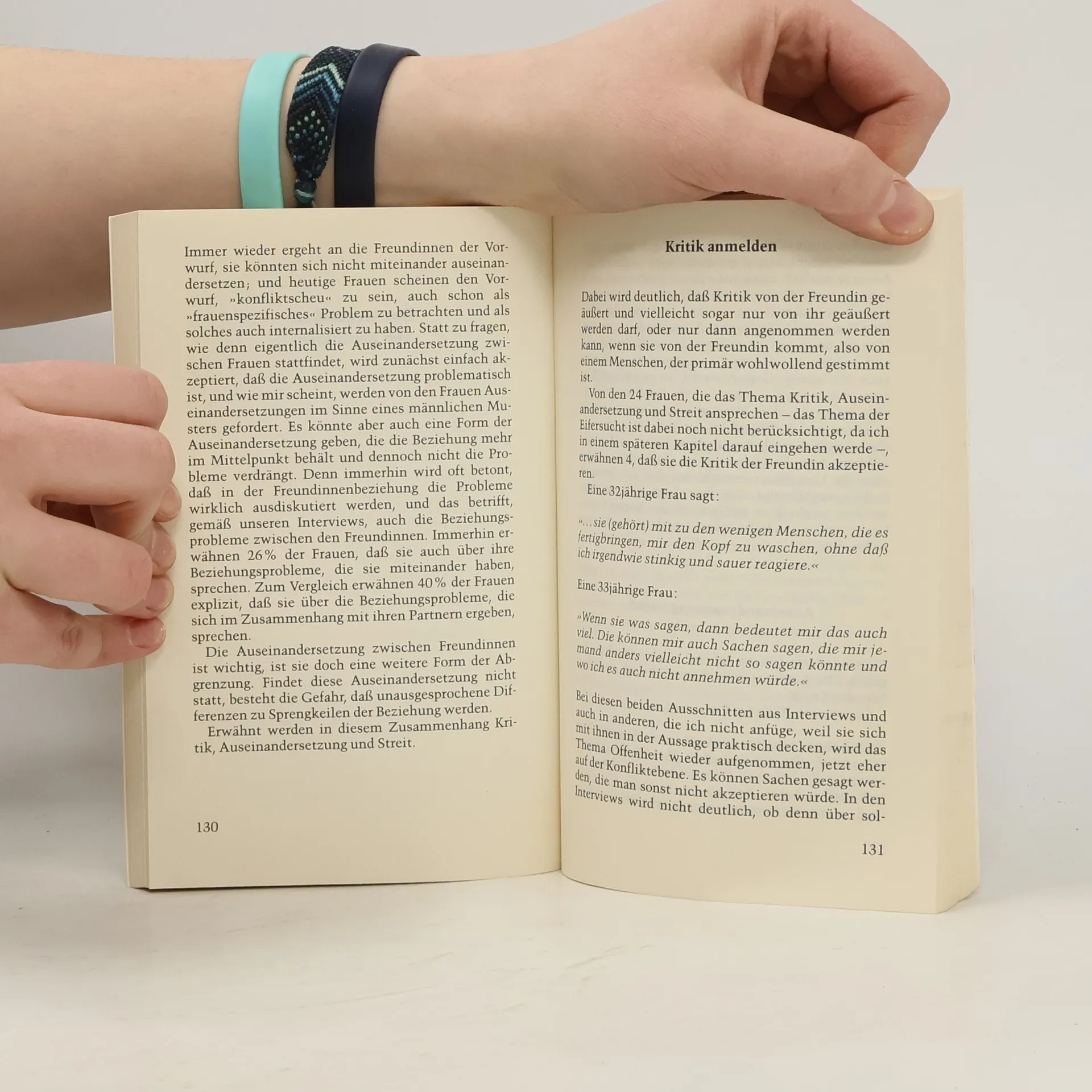 Die Psychotherapeutin Verena Kast untersucht in ihrem Buch die Qualität von Freundschaftsbeziehungen unter Frauen. Sie kommt zu dem Schluß, daß zwischen Freundinnen die höchsten Werte menschlicher Beziehung wie Verläßlichkeit, Zärtlichkeit, Freude und Solidärität gelebt werden.