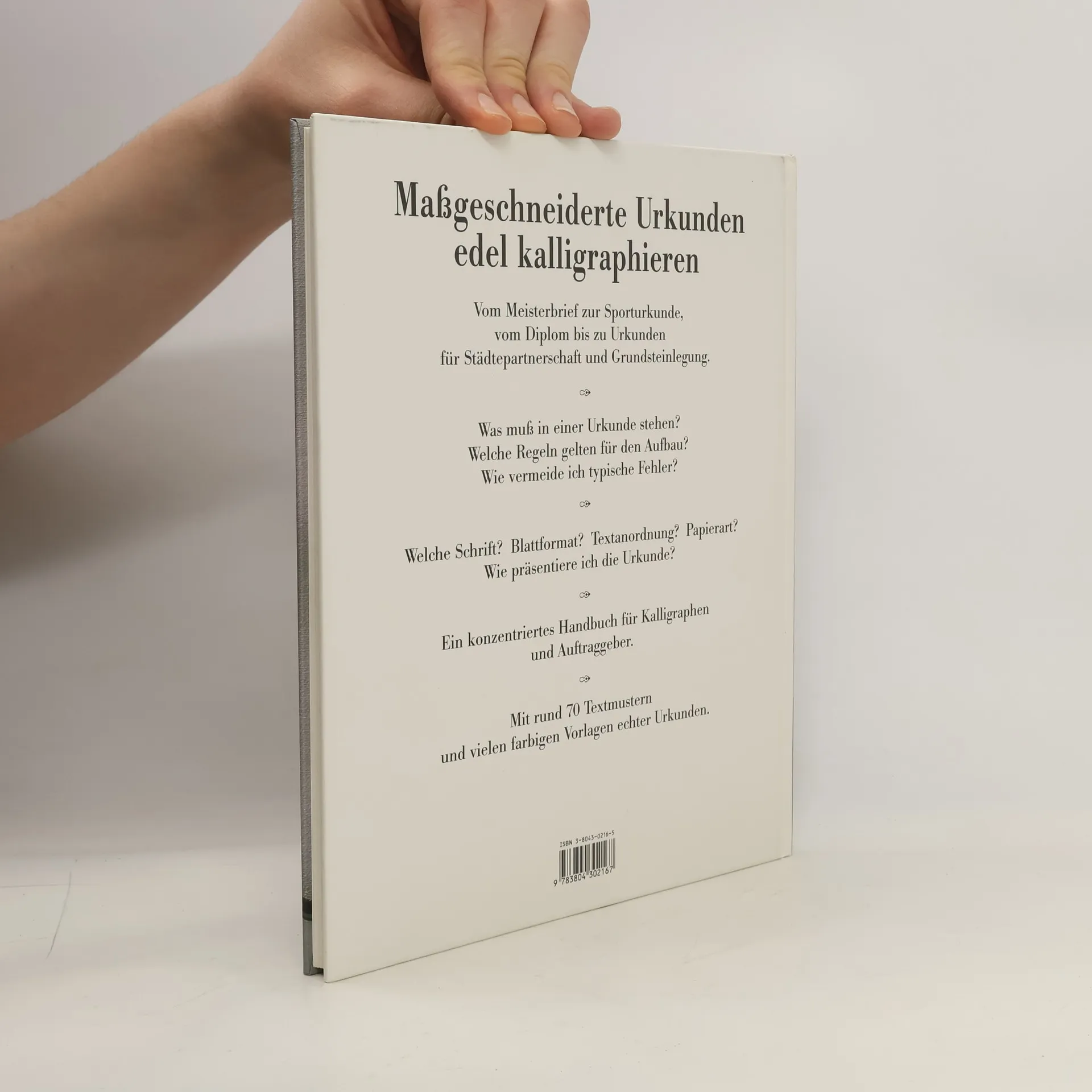 Maßgeschneiderte Urkunden edel kalligraphierenVom Meisterbrief zur Sporturkunde, vom Diplom bis zu Urkunden fürStädtepartnerschaften und Grundsteinlegung.Was muss in einer Urkunde stehen?Welche Regeln gelten für den Aufbau?Wie vermeide ich typische Fehler?Welche Schrift? Blattformat? Textanordnung? Papierart?Wie präsentiere ich die Urkunde?Ein konzentriertes Handbuch für Kalligraphen und Auftraggeber.Mit rund 70 Textmustern und vielen farbigen Vorlagen echter Urkunden.