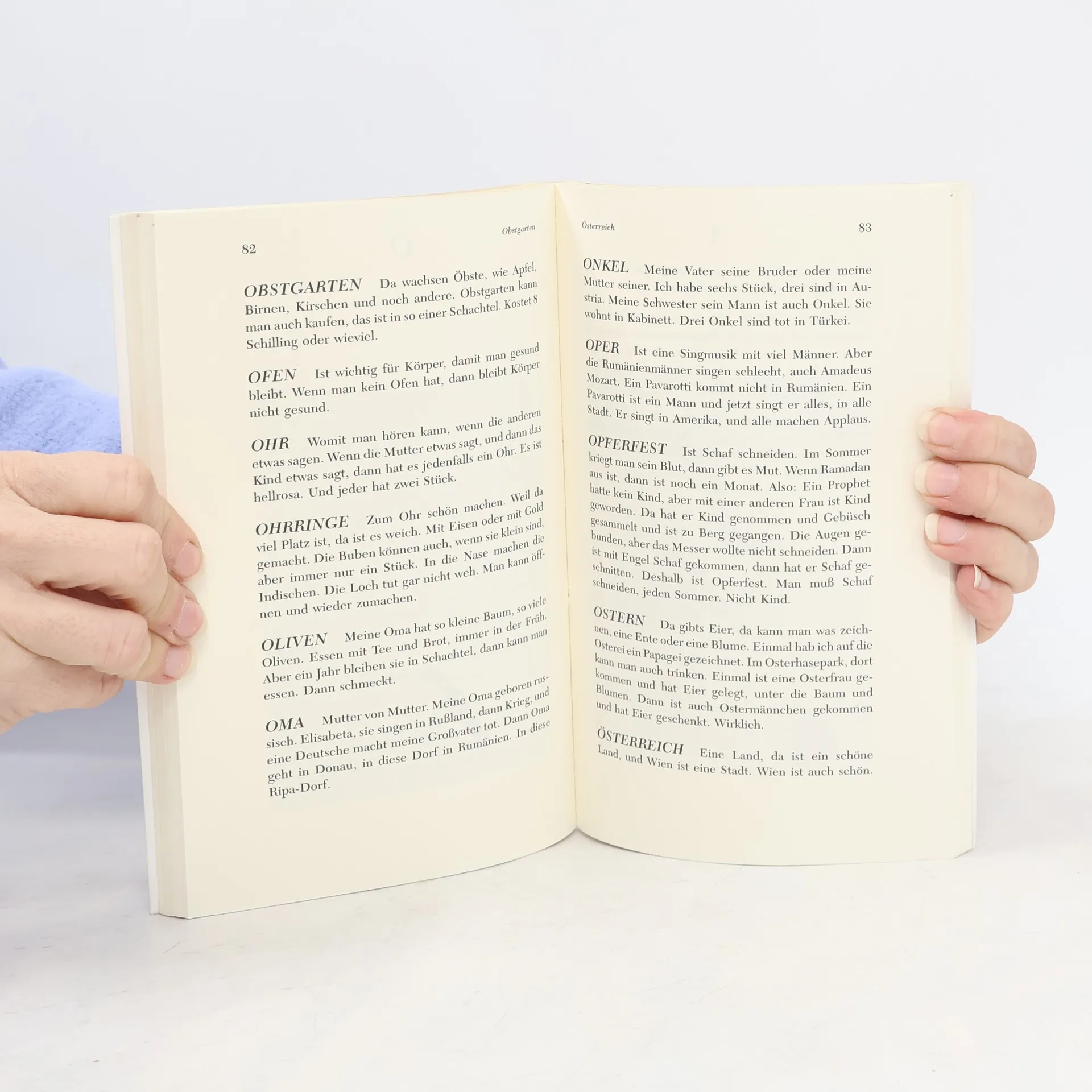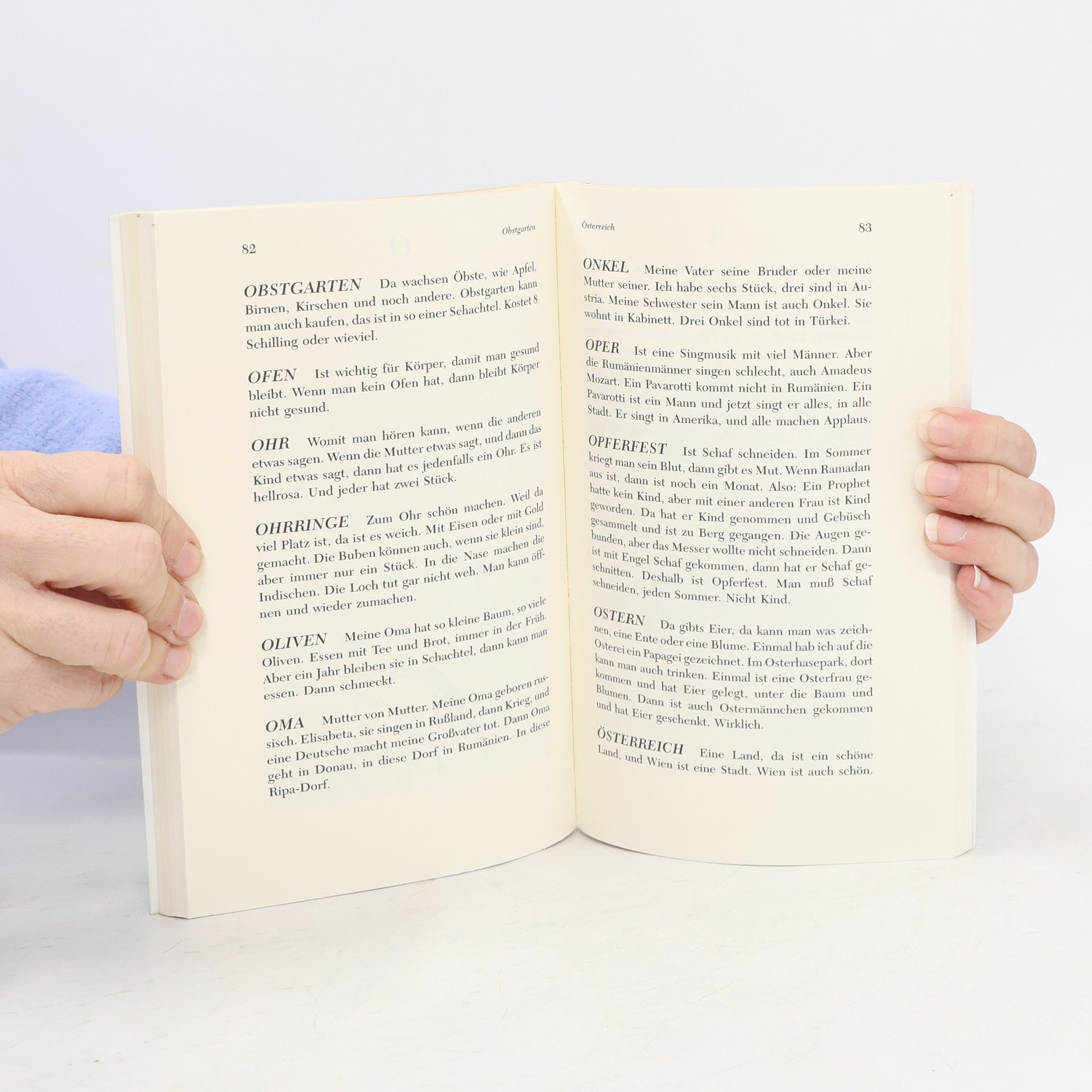 Als ein Ergebnis der Unterrichtarbeit an Volksschulen mit Kindern nichtdeutscher Muttersprache entstand "Blume ist Kind von Wiese": Kinder aus Wien, aus ost- und südeuropäischen Ländern, der Türkei und sogar aus China versuchen Begriffe zu erklären, die von Helga Glantschnig im "Originalton" niedergeschrieben bzw. nachformuliert wurden. Sprachwissenschaftlich und soziokulturell höchst interessant - für Eltern, LehrerInnen und ErzieherInnen sowie alle, die sich vom Kindermund etwas abschauen wollen.