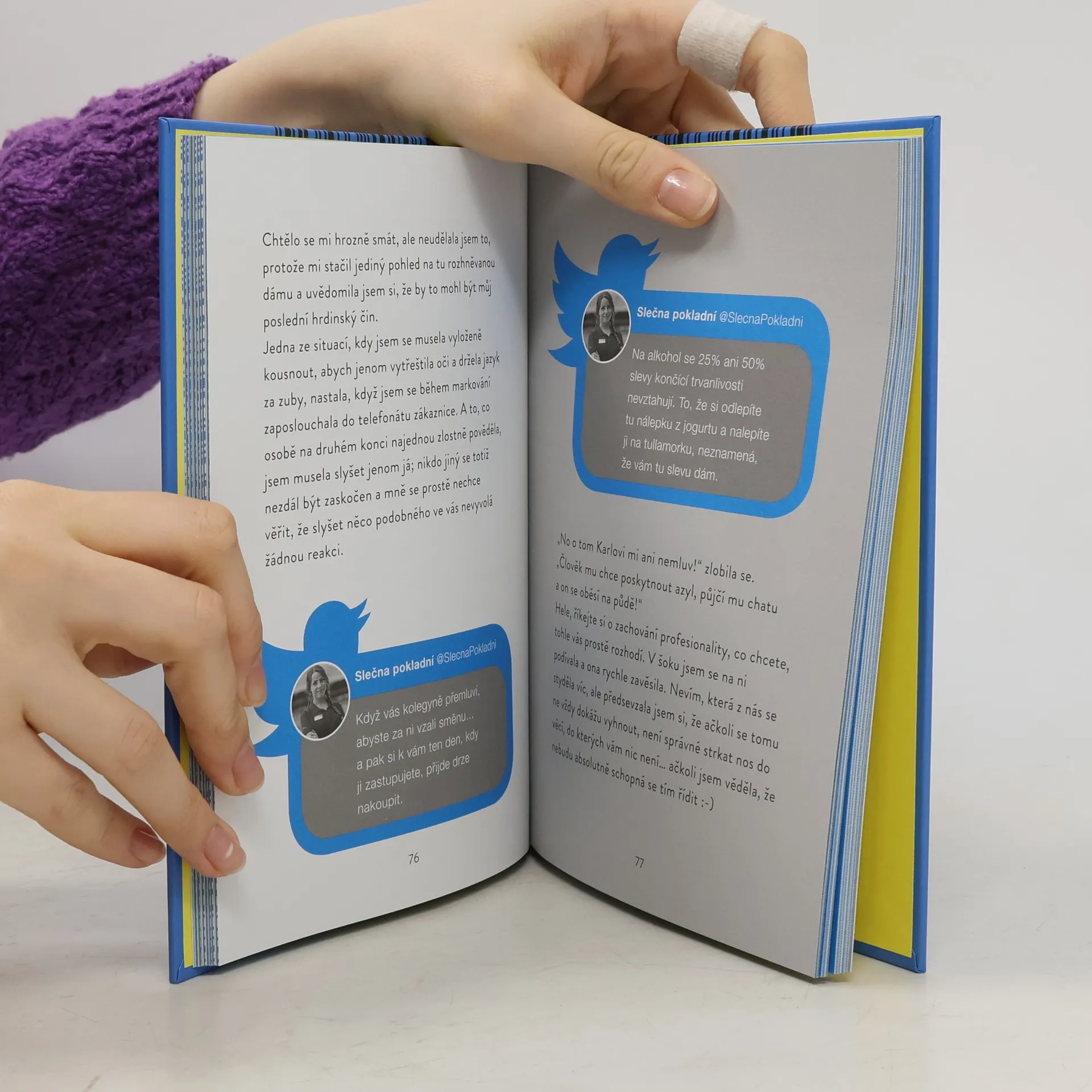 Peklo, pokladna a Twitter. Krátce před mými osmnáctými narozeninami se mí rodiče rozhodli, že bych si měla najít brigádu, abych poznala hodnotu peněz, naučila se zodpovědnosti a všechny tyhle dospělácké rodičovské řeči, které zní dětem vyloženě úchylně. Svůj životopis, který obsahoval pouze jméno, údaje o základní škole a právě studovaném oboru, jsem rozeslala do dvou obchodů. Z jednoho se mi ozvali, a tak začala má pultovní kariéra! Byla jsem odhodlaná dělat cokoli, jenom ne pokladní. Takže jsem se v listopadu 2016 poprvé postavila za kasu. Tahle práce mě ale začala docela dost bavit. Bylo to jako na Superhrách, kdy se musíte postarat o restauraci nebo hotel; kontrolovala jsem si fronty, doplňovala letáky, odnášela košíky zpátky ke vchodu, odbíhala vážit zeleninu… a i se zákazníky byla kolikrát sranda. Protože jsem doma už svým vyprávěním o zážitcích z obchodu všechny otravovala, začala jsem své příspěvky dávat na internet. Příběhy, které jsem nezveřejňovala, protože byly delší a komplikovanější, najdete v této knize. A s nimi i ty krátké.