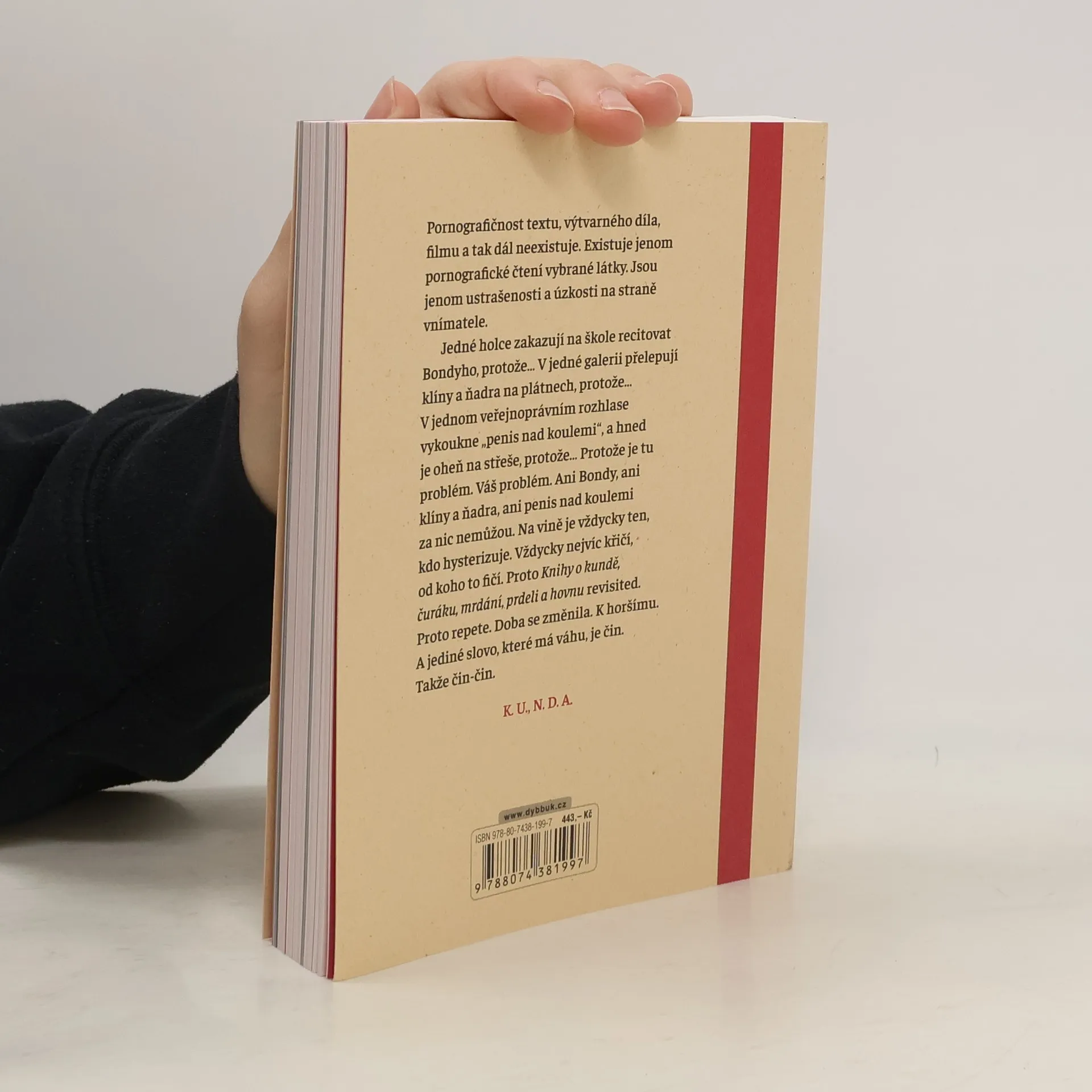 „KNIHA O“ je sbírka více než tří set erotických textů z pera spisovatelů uznávaných, zatracovaných i anonymních, bohatě ilustrovaná výtvarníky napříč staletími. Navazuje na kontroverzní Knihu o kundě a rozšiřuje ji o další texty i díla současných českých umělců. Ať už v literatuře či v umění, erotika je nevysychající pramen fantazie a života… Kunda je cesta, po které sem člověk přišel a ke které se celý život vrací. Když penis stojí, je připraven, a když je připraven, je to neslušnost. I v dnešní době existují tabu, přičemž život ze samotné své povahy přestupuje veškerá omezení… „Pornografičnost textu, výtvarného díla, filmu a tak dál neexistuje. Existuje jenom pornografické čtení vybrané látky. Jsou jenom ustrašenosti a úzkosti na straně vnímatele. Jedné holce zakazují na škole recitovat Bondyho, protože… V jedné galerii přelepují klíny a ňadra na plátnech, protože… V jednom veřejnoprávním rozhlase vykoukne „penis nad koulemi“, a hned je oheň na střeše, protože… Protože je tu problém. Váš problém. Ani Bondy, ani klíny a ňadra, ani penis nad koulemi za nic nemůžou. Na vině je vždycky ten, kdo hysterizuje. Vždycky nejvíc křičí, od koho to fičí. Proto repete. Doba se změnila. K horšímu. A jediné slovo, které má váhu, je čin. Takže čin-čin.“