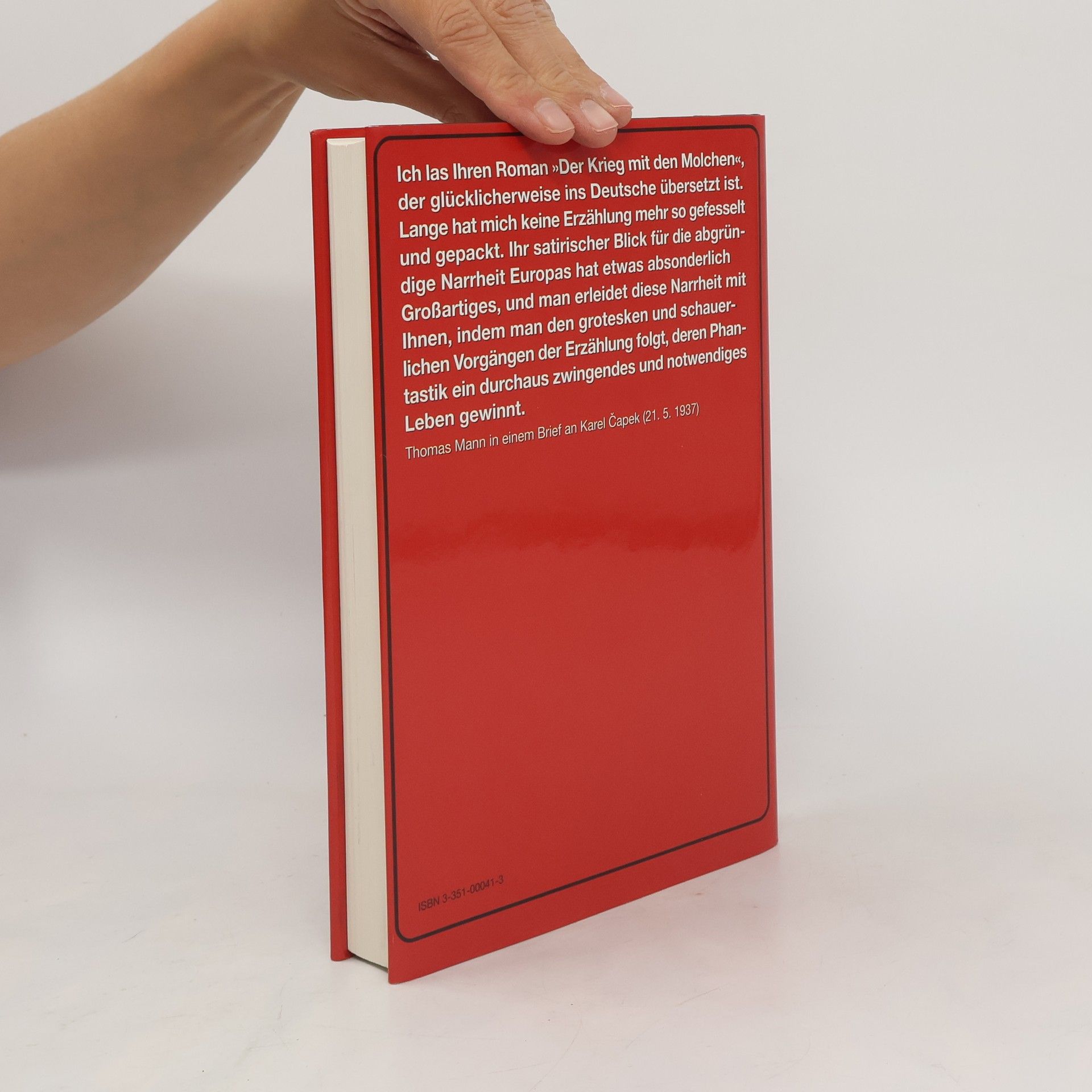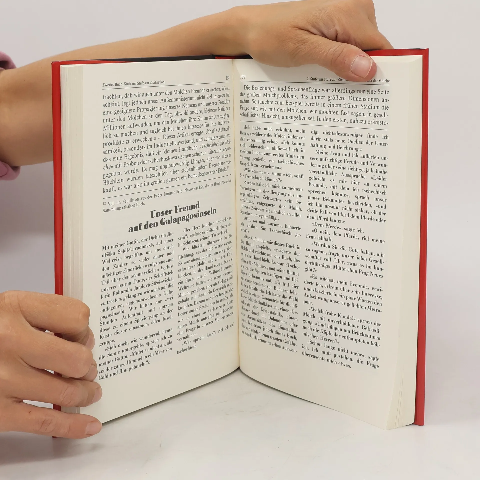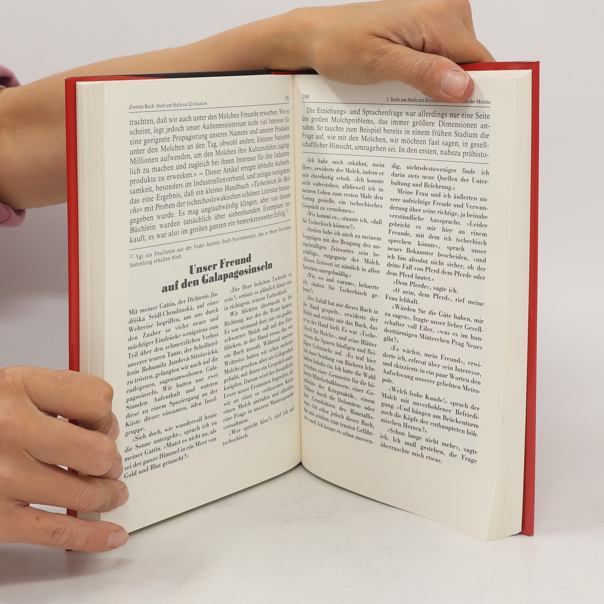 Lange blieben sie der Welt verborgen: Sprachbegabte Riesenmolche: den Menschen sehr ähnlich. Zunächst als billige Arbeitskräfte missbraucht, wenden sie sich schließlich gegen ihre Ausbeuter. Ein Krieg um die Weltherrschaft beginnt … Hans Ticha hat das Werk auf allen Ebenen durchgestaltet, seine virtuose Typographie spielt mit dem formalen Erscheinungsbild der Texte. Zu seiner bekannten Bildsprache tritt eine Feuerwerk an Illustrationen der unterschiedlichsten Stilrichtungen: Zitate von Pop-Art, wissenschaftlich anmutende Zeichnungen auf braunem Fond und Bildrasterpunkte, die gedruckte Quellen suggerieren. Entstanden ist „eines der schönsten Bücher der deutschen Buchgeschichte, das dem polyphonen Anspielungsreichtum des Romans kongenial entspricht“, so Florian Balke von der FAZ.