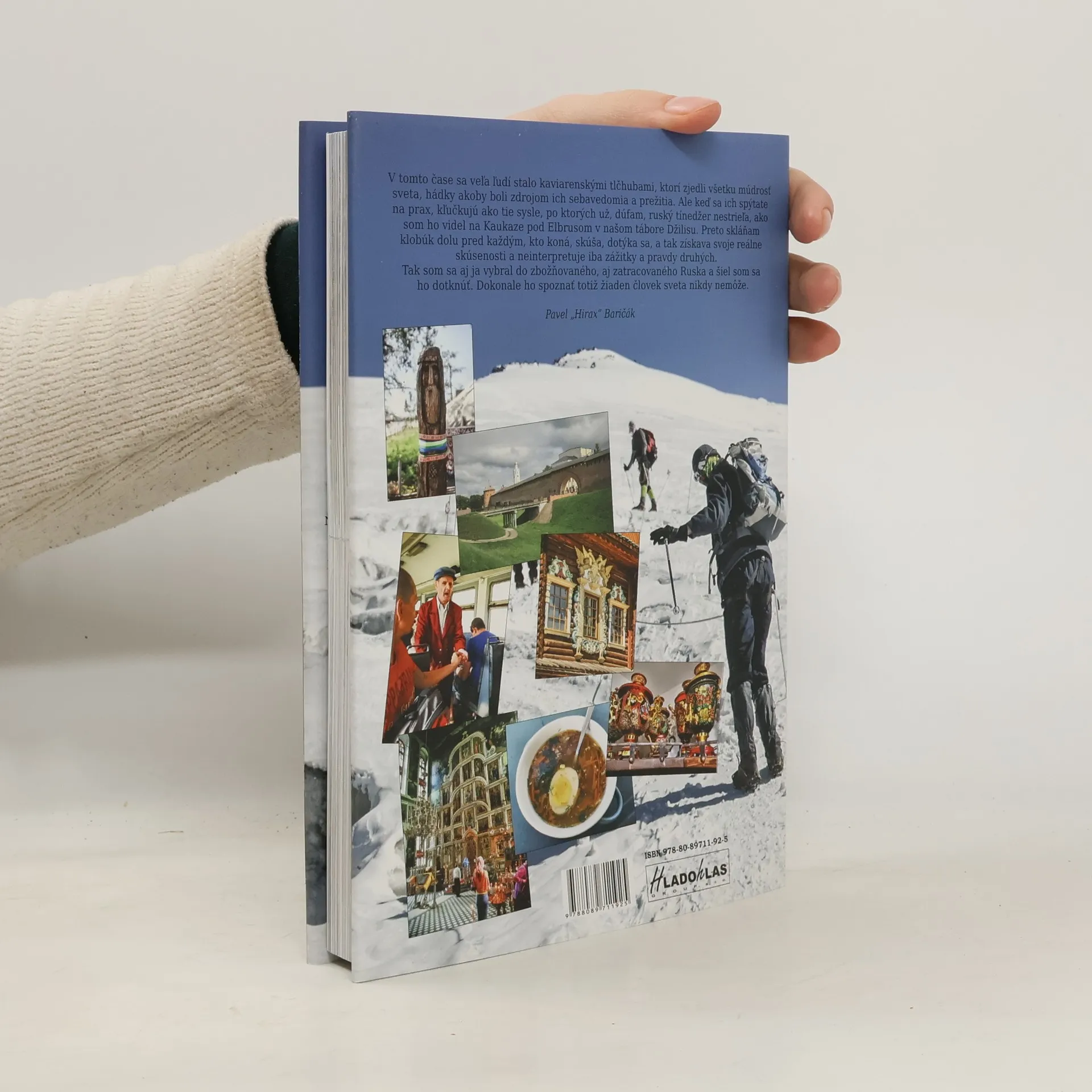 RUSKO - Zbožňované aj zatracované. Výstup na Elbrus severnou stranou, Moskva, Volgograd, Velikij Novgorod, Jarosľav, Piatigorsk... "V tejto dobe sa veľa ľudí stalo kaviarenskými tlčhubami, ktorí zjedli všetku múdrosť sveta, hádky akoby boli zdrojom ich sebavedomia a prežitia. Ale keď sa ich spýtate na prax, kľučkujú ako tie sysle, po ktorých už dúfam ruský tínedžer nestrieľa, ako som ho videl na Kaukaze pod Elbrusom v našom tábore Džilisu. Preto skláňam klobúk dolu pred každým, kto koná, skúša, dotýka sa a tak získava svoje reálne skúsenosti a neinterpretuje iba zážitky a pravdy druhých. Tak som sa aj ja vybral do zbožňovaného, aj zatracovaného Ruska a šiel som sa ho dotknúť. Dokonalo ho spoznať totiž žiaden človek sveta nikdy nezmôže." (Pavel „Hirax“ Baričák)