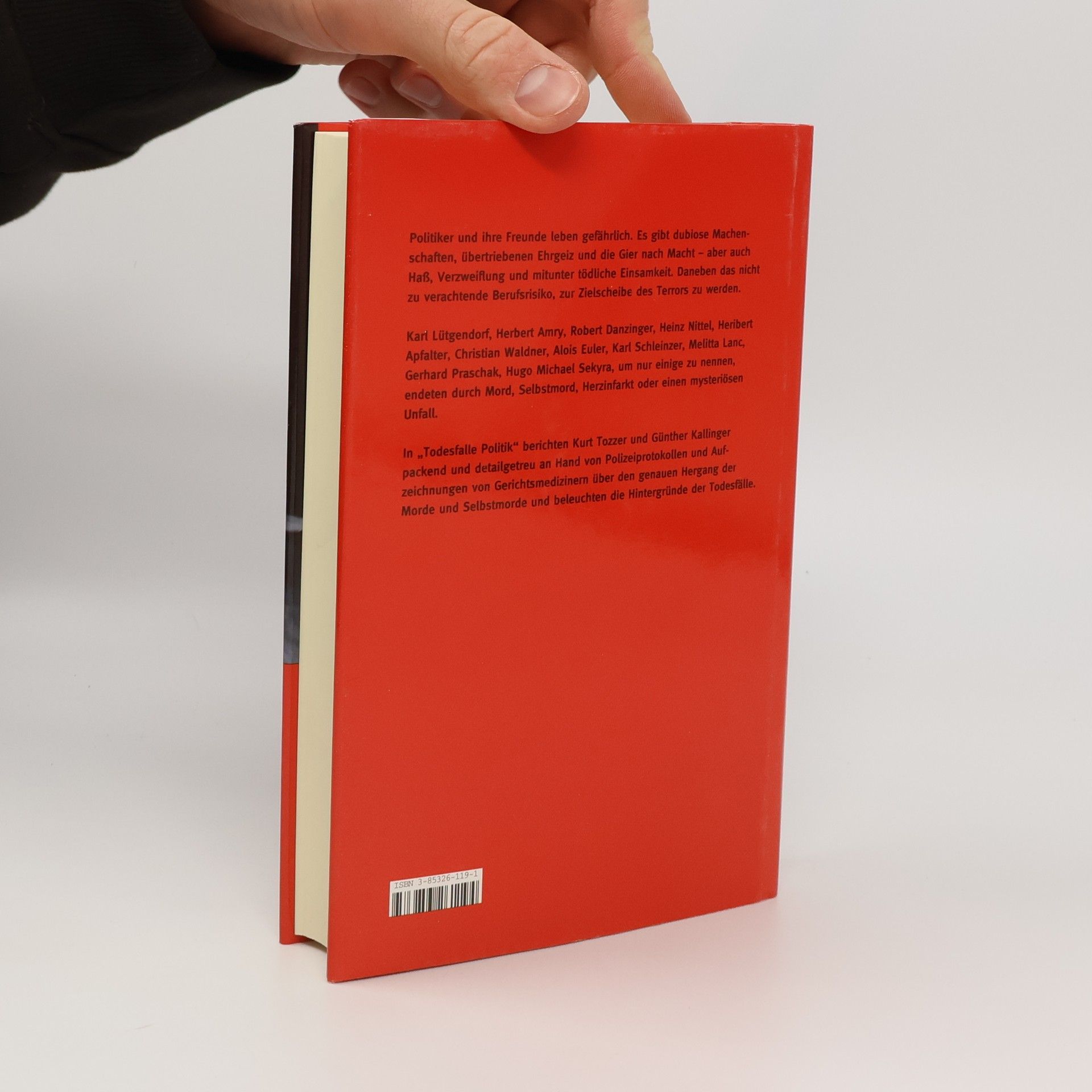 In "Todesfalle Politik" berichten Kurt Tozzer und Günther Kallinger packend und detailgetreu an Hand von Polizeiprotokollen und Aufzeichnungen von Gerichtsmedizinern über den genauen Hergang der Morde und Selbstmorde und beleuchten die Hintergründe der Todesfälle