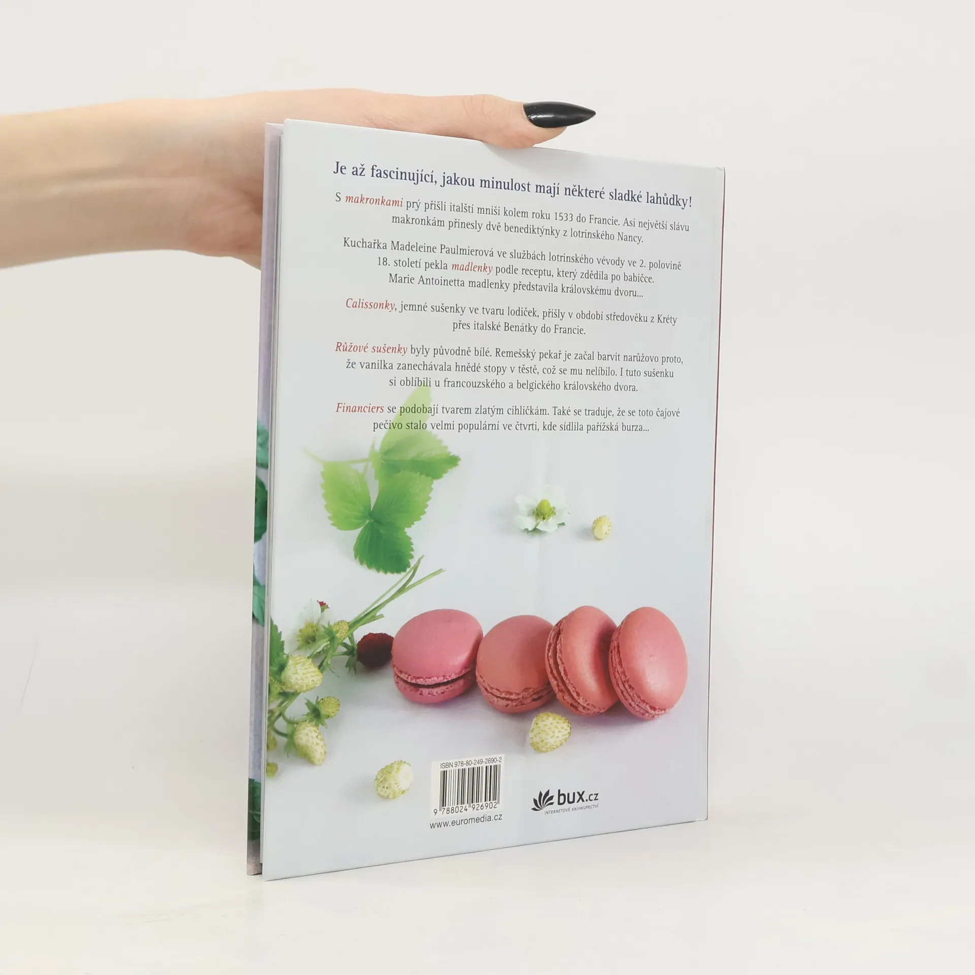 Otevíráte knihu, která je plná opravdových delikates. Vedeni krok za krokem mistryní cukrářkou je snadno připravíte i doma. Společně s ní procházejte základním postupem, nic nevynechávejte ani nepřeskakujte, vyvarujte se chyb, na které upozorňuje, a upečete vynikající francouzské dezerty – makronky, madlenky, cannelés, financiers, kokosky, vaflové trubičky, lodičky z Marseille nebo bretaňské karamelky.