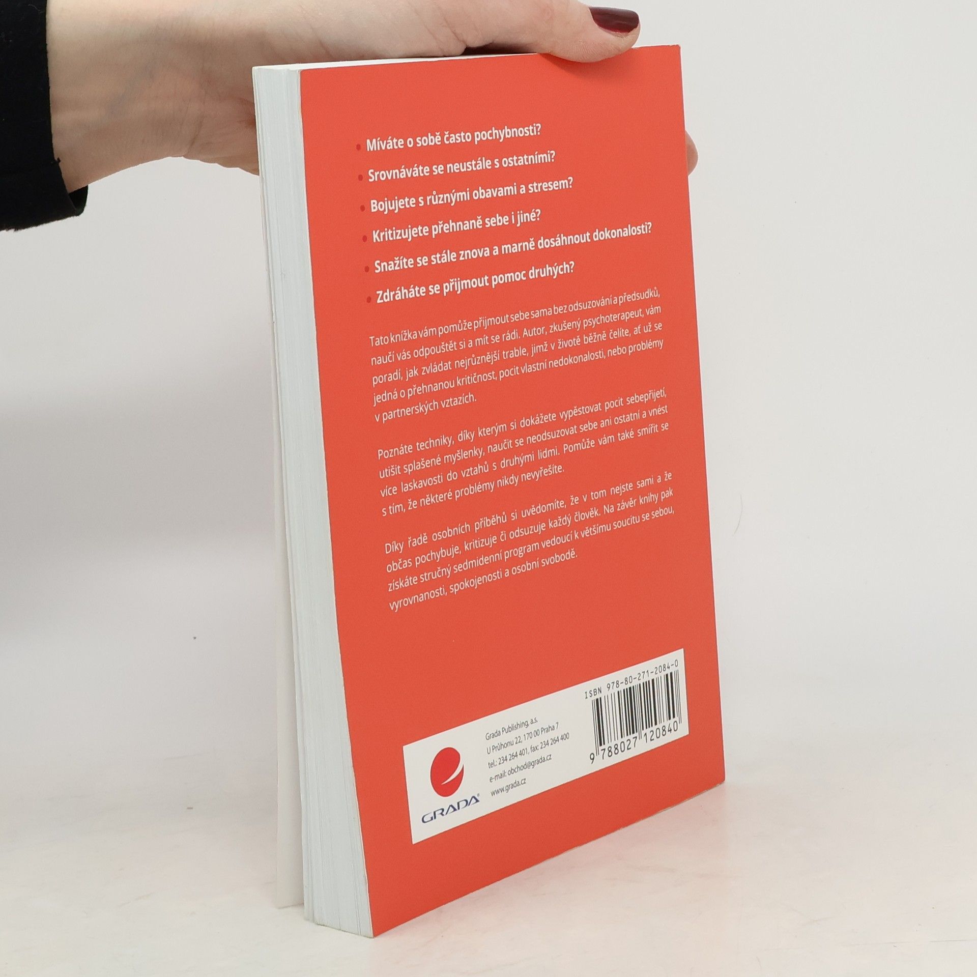 • Míváte o sobě často pochybnosti? • Srovnáváte se neustále s ostatními? • Bojujete s různými obavami a stresem? • Kritizujete přehnaně sebe i jiné? • Snažíte se stále znova a marně dosáhnout dokonalosti? • Zdráháte se přijmout pomoc druhých? Tato knížka vám pomůže přijmout sebe sama bez odsuzování a předsudků, naučí vás odpouštět si a mít se rádi. Autor, zkušený psychoterapeut, vám poradí, jak zvládat nejrůznější trable, jimž v životě běžně čelíte, ať už se jedná o přehnanou kritičnost, pocit vlastní nedokonalosti, nebo problémy v partnerských vztazích. Poznáte techniky, díky kterým si dokážete vypěstovat pocit sebepřijetí, utišit splašené myšlenky, naučit se neodsuzovat sebe ani ostatní a vnést více laskavosti do vztahů s druhými lidmi. Pomůže vám také smířit se s tím, že některé problémy nikdy nevyřešíte. Díky řadě osobních příběhů si uvědomíte, že v tom nejste sami a že občas pochybuje, kritizuje či odsuzuje každý člověk. Na závěr knihy pak získáte stručný sedmidenní program vedoucí k většímu soucitu se sebou, vyrovnanosti, spokojenosti a osobní svobodě.