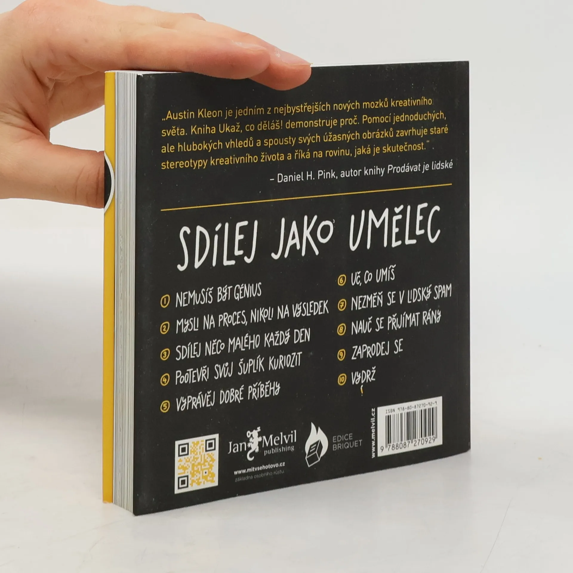 Pochodeň tvořivosti, kterou jste získali díky předchozí knize, nyní pokračuje s novými podněty. Austin Kleon opět přináší deset kapitol plných povzbuzení a nadšení pro tvorbu a její sdílení. Tentokrát se zaměřuje na to, že velkorysost vítězí nad géniem a že být vidět a umožnit ostatním, aby "kradli", je klíčem k tomu, stát se známým tvůrcem. Zatímco předchozí kniha nabádala k ovlivňování skrze díla jiných, nyní se zaměřuje na to, jak ovlivňovat ostatní sdílením vlastního díla. Naučíte se, proč a jak sdílet, a s kým. Kleon oslovuje i ty, kteří se zdráhají propagovat sami sebe, a ukazuje, jak představit svou práci a proces tvoření bez pocitu viny. Kniha je určena pro tvůrce, kteří se stydí za své úspěchy. Zjistíte, že nemusíte být génius, abyste mohli sdílet své dílo se světem. Každodenní sdílení vaší práce je cennější než skryté úsilí na životním díle. Objevíte, jak vyprávět příběhy o svých zajímavostech a získáte rady, jak se vyhnout přehnané propagaci a jak čelit obtížím. S pomocí úspěšných umělců minulosti i současnosti pochopíte, že kreativita je způsob myšlení, nikoli pouze talent.