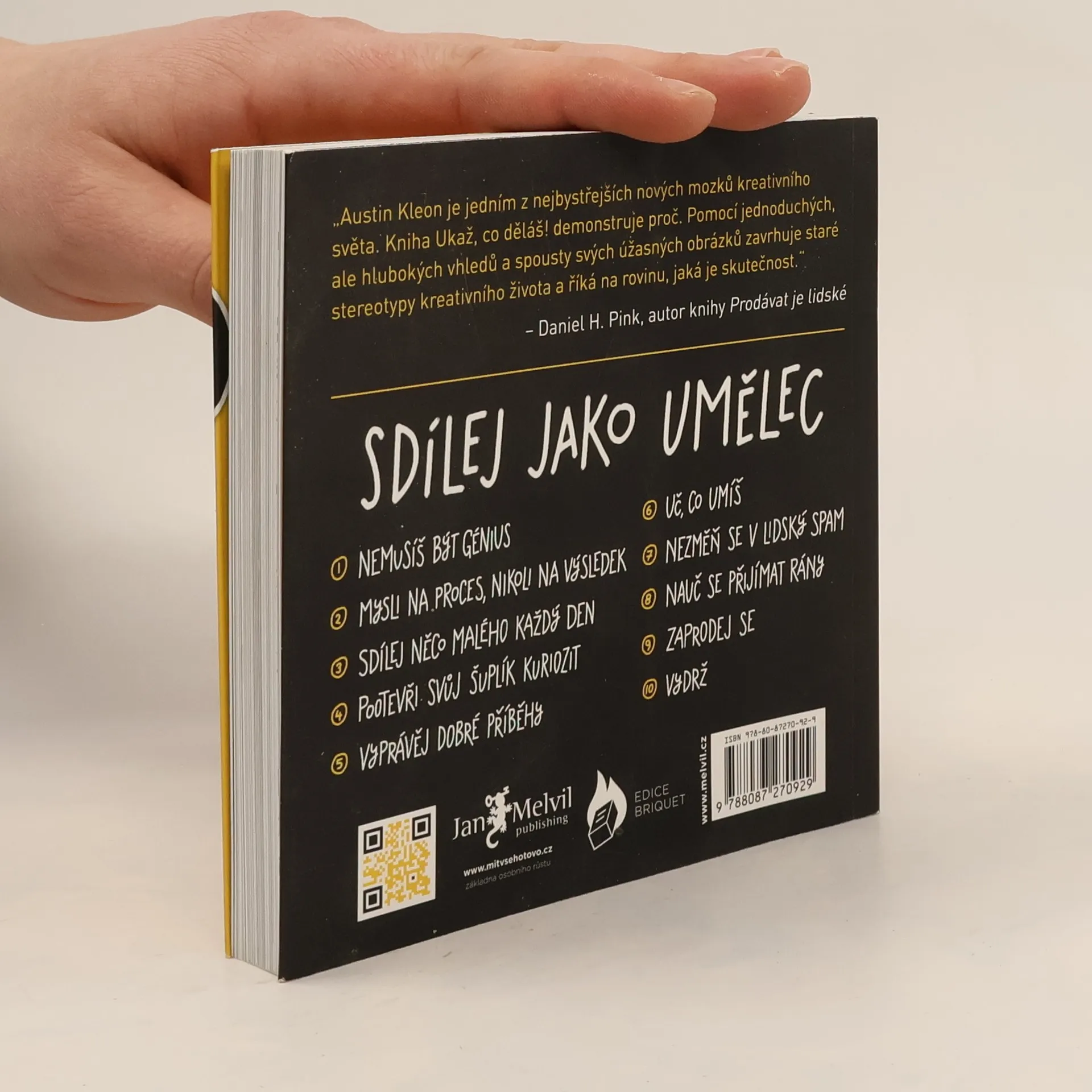 Pochodeň tvořivosti, kterou jste získali díky předchozí knize, nyní pokračuje s novými podněty. Austin Kleon opět přináší deset kapitol plných povzbuzení a nadšení pro tvorbu a její sdílení. Tentokrát se zaměřuje na to, že velkorysost vítězí nad géniem a že být vidět a umožnit ostatním, aby "kradli", je klíčem k tomu, stát se známým tvůrcem. Zatímco předchozí kniha nabádala k ovlivňování skrze díla jiných, nyní se zaměřuje na to, jak ovlivňovat ostatní sdílením vlastního díla. Naučíte se, proč a jak sdílet, a s kým. Kleon oslovuje i ty, kteří se zdráhají propagovat sami sebe, a ukazuje, jak představit svou práci a proces tvoření bez pocitu viny. Kniha je určena pro tvůrce, kteří se stydí za své úspěchy. Zjistíte, že nemusíte být génius, abyste mohli sdílet své dílo se světem. Každodenní sdílení vaší práce je cennější než skryté úsilí na životním díle. Objevíte, jak vyprávět příběhy o svých zajímavostech a získáte rady, jak se vyhnout přehnané propagaci a jak čelit obtížím. S pomocí úspěšných umělců minulosti i současnosti pochopíte, že kreativita je způsob myšlení, nikoli pouze talent.