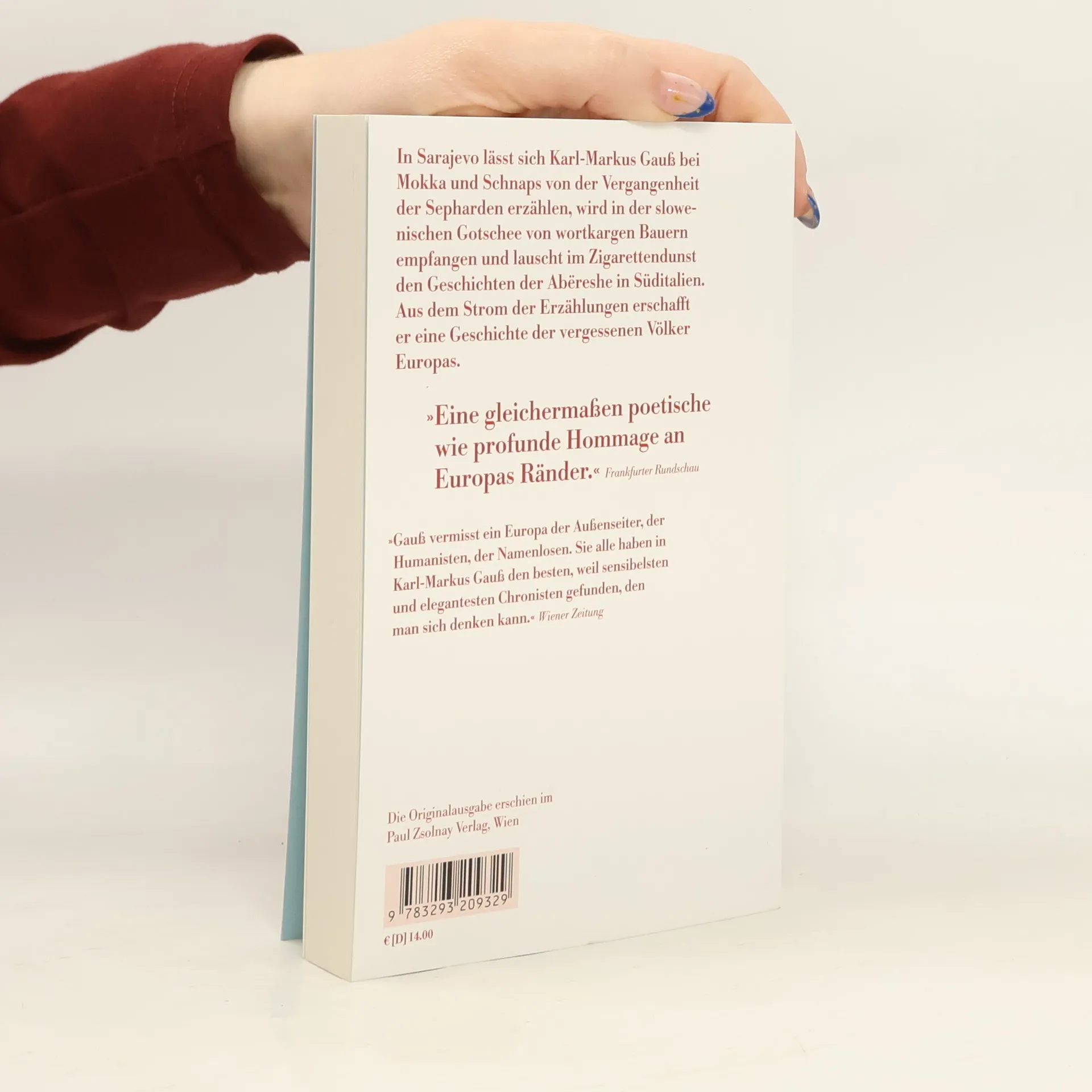 In Sarajevo lässt sich Karl-Markus Gauß bei einem Mokka und trübem Schnaps von der Vergangenheit der Sepharden erzählen. Er bahnt sich einen Weg in die slowenische Gotschee, wird empfangen von einem wortkargen Bauern und misstrauischen Hunden. Im Dunst von Zigaretten und Minze lauscht er den Abëreshe, vom Sturm der Geschichte in ein süditalienisches Bergdorf geweht. Er fährt nach Ostdeutschland, ins Herzland der katholischen Sorben, wo seit Jahrhunderten jeder zwei Namen trägt. Er sucht die Aromunen in Mazedonien auf, eines der ältesten Völker Europas, im 20. Jahrhundert ins Abseits geraten. Gauß lässt sich mitreißen vom Strom der Erzählungen und erschafft daraus eine Geschichte der vergessenen Völker Europas, nimmt uns mit in die verborgenen Winkel des Kontinents.