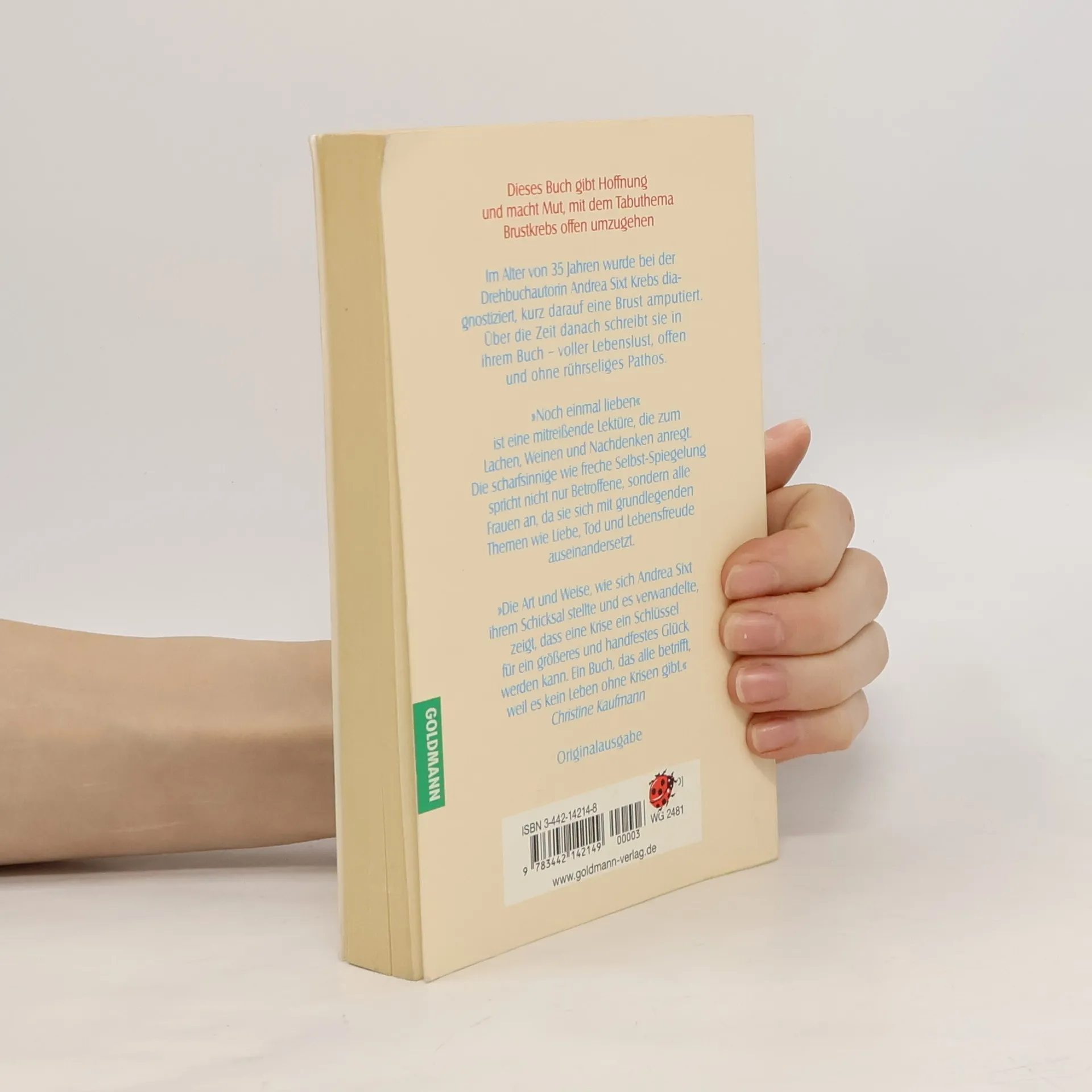 Es war kurz vor Weihnachten, als Andrea Sixt glaubte, am Anfang eines Alptraums zu stehen. Diagnose Brustkrebs. Ihr Partner konnte damit nicht umgehen, die Beziehung zerbrach. Mit eindrucksvoller Offenheit beschreibt die Autorin die verschiedenen Stufen ihres Lebens nach der Brustamputation: Ihre grenzenlose Freude, überlebt zu haben, aber auch ihre anfängliche diffuse Angst, für Männer nicht mehr schön und begehrenswert zu sein. Heute, fünf Jahre „danach“, kommt sie zu dem beeindruckenden Schluss, dass der Krebs die Chance in ihrem Leben für eine positive Veränderung war. Denn durch die Krankheit musste sie sich mit sich selbst, ihren Träumen und ihrer großen Sehnsucht, zu lieben und geliebt zu werden, auseinander setzen. Nur so ist sie zu dem geworden, was sie heute ist – eine selbstbewusste, positive Frau, die ihre eigenen Bedürfnisse lebt und so erwachsen liebt, wie nie zuvor. Andrea Sixts Buch geht sehr offen mit dem Tabuthema Brustkrebs um. Es ist auch ein autobiografischer Roman, der einfühlsam und fesselnd bis zur letzten Seite ihre Lebensphilosophie beschreibt, jedes Schicksal als Chance anzunehmen.
