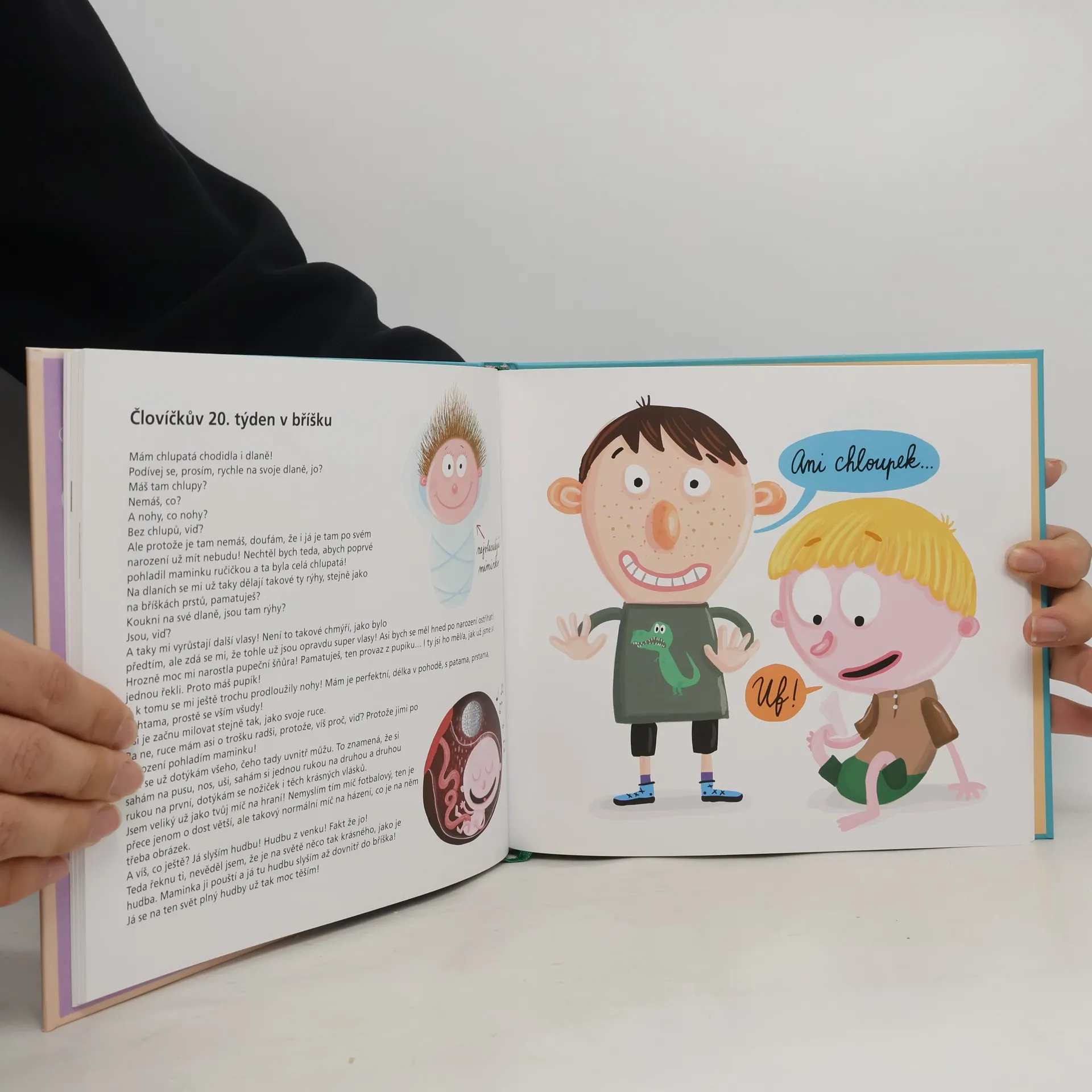 Ideální knížka pro budoucí starší sourozence, ale i zvídavé jedináčky Věděli jste, jak miminko prožívá dobu před svým narozením? Kdy malému človíčkovi v maminčině břiše začínají růst nehty? Kdy si už dokáže cucat palec? Nebo jak čůrá? To všechno, a ještě mnohem víc, vámve 42 kapitolách, odstupňovaných podle týdnů těhotenství, poví ta nejpovolanější osoba. Samotné miminko v děloze. A věřte, že se nebudete ani chvilku nudit!
