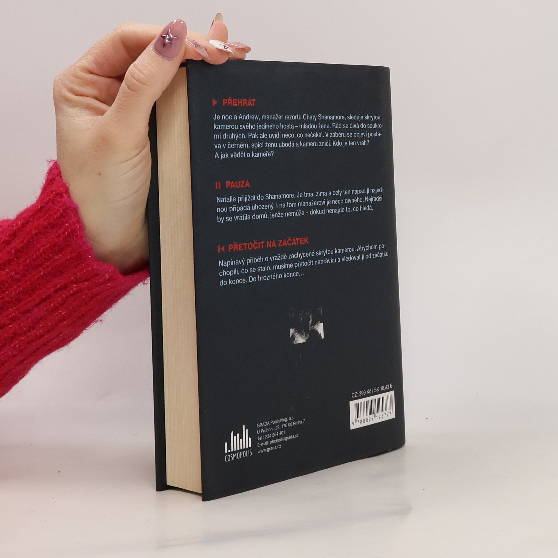 PŘEHRÁT Je noc a Andrew, manažer rezortu Chaty Shanamore, sleduje skrytou kamerou svého jediného hosta – mladou ženu. Rád se dívá do soukromí druhých. Pak ale uvidí něco, co nečekal. V záběru se objeví postava v černém, spící ženu ubodá a kameru zničí. Kdo je ten vrah? A jak věděl o kameře? PAUZA Natalie přijíždí do Shanamore. Je tma, zima a celý ten nápad jí najednou připadá uhozený. I na tom manažerovi je něco divného. Nejradši by se vrátila domů, jenže nemůže – dokud nenajde to, co hledá. PŘETOČIT NA ZAČÁTEK Napínavý příběh o vraždě zachycené skrytou kamerou. Abychom pochopili, co se stalo, musíme přetočit nahrávku a sledovat ji od začátku do konce. Do hrozného konce…