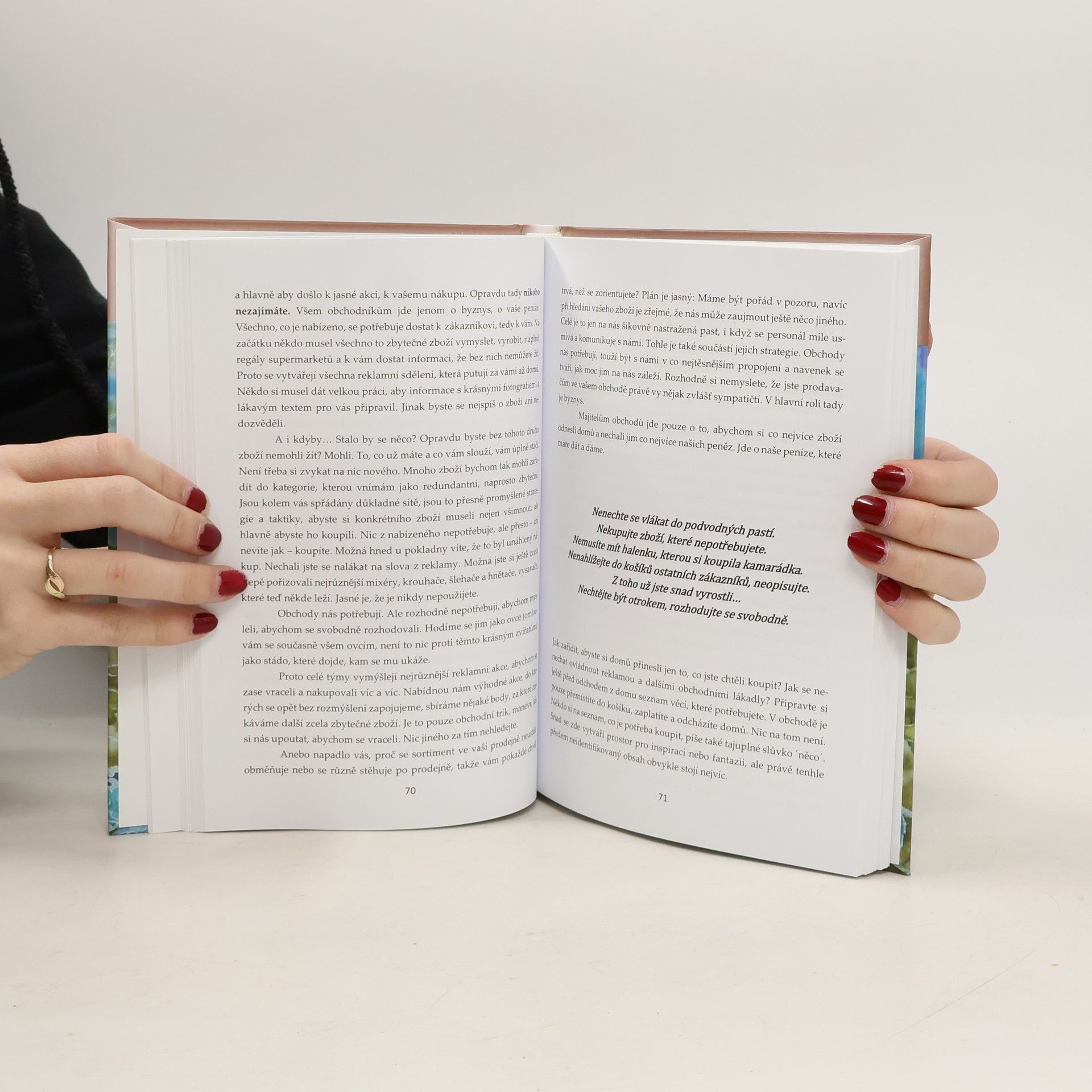 Autorka pojmenovává problémy, které člověka trápí během jednotlivých životních etap od narození, přes dětství, dospívání, až po vlastní náhled na svou osudovou cestu. Zamýšlí se nad otázkou ´kdo za to může´, když se nám nedaří. Proč tak dlouho a zcela zbytečně zůstáváme v roli hodného dítěte a proč to samé časem paradoxně nutíme vlastním dětem. Je to past, v které setrváváme, místo toho, abychom se dostali do hlavní role ve svém vlastním životě. Mezi řádky jsou zřejmé nejen prožité zkušenosti. Autorka jako ilustraci zařazuje i konkrétní případy ze své klientské praxe. Velká část je věnována také partnerským otazníkům, zvlášť diskutabilní jsou témata ohledně bojů mezi ženami a muži. Poslední z 12 kapitol s názvem ´Poodhalme příčiny propadů´ přibližuje netradiční způsob výkladu na dálku, přes skype, v knize zůstala zachována autenticita konkrétních klientů v přímé řeči. Kniha mezi řádky přináší návod, jak svůj život opravdu naplno žít, jak jej přeladit z toho, co se nám nelíbí, co drhne, co nechceme, do polohy, v které si život můžeme užívat. Důraz je kladen na radost v jakékoliv formě a na opravdové prožívání každé přítomné vteřiny. Je rozdělena na 12 kapitol, každá má v názvu tři slova začínající písmenem P. Volně navazuje na předchozí knihu „Jak rozumět vlastní duši“, která vyšla v roce 2015.