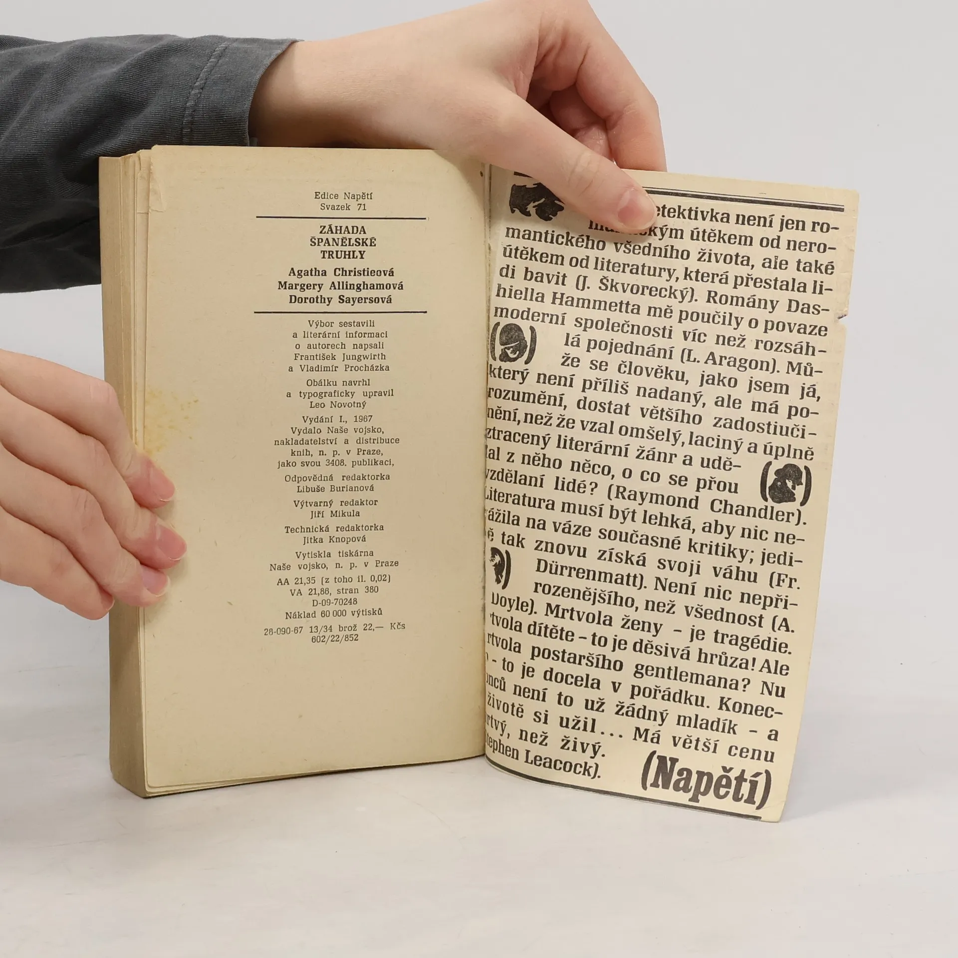 Povídky A. Christieové, M. Allinghamové a D. L. Sayersové. Výbor sestavili F. Jungwirth a V. Procházka. Povídky: Záhada španělské truhly – Agatha Christie Slavičí hnízdo – Agatha Christie Duše krupiérova – Agatha Christie Čtyři podezřelí – Agatha Christie Společnice – Agatha Christie Utopená – Agatha Christie Bylina smrti – Agatha Christie Zakrýt si oči – Margery Allingham Ohavná historka o muži s měděnými prsty – Dorothy Leigh Sayers Cynická aféra hazardního hráče – Dorothy Leigh Sayers Učené dobrodružství s dračí hlavou – Dorothy Leigh Sayers Nerozřešená záhada s mužem bez tváře – Dorothy Leigh Sayers Senzační dobrodružství v jeskyni Ali Babově – Dorothy Leigh Sayers