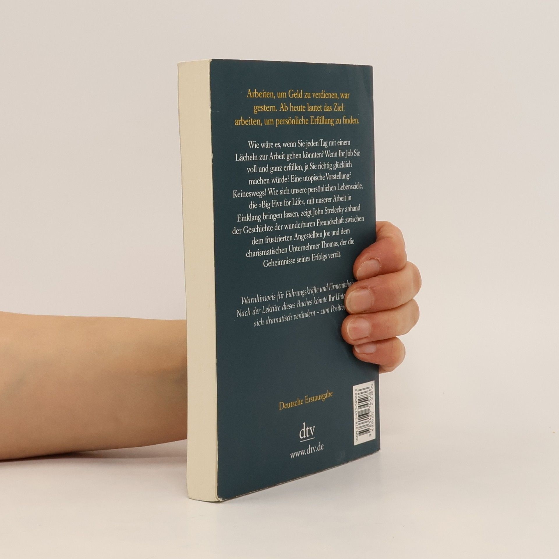Arbeiten, um Geld zu verdienen, war gestern Durch Zufall lernt Joe, ein mit seinem Job unzufriedener Angestellter, den charismatischen Geschäftsmann Thomas kennen. Rasch entwickelt sich eine tiefe Freundschaft zwischen den beiden Männern. Thomas wird zu Joes Mentor und offenbart ihm die Geheimnisse seines Erfolgs. Er zeigt Joe, wie wichtig es ist, auch in der Arbeit erfüllt zu sein. Seine Unternehmen führt Thomas anhand zweier Leitlinien: Jeder Mitarbeiter muss seine Bestimmung sowie seine »Big Five for Life« kennen, also wissen, welche fünf Ziele er im Leben erreichen will. Diese Ideen helfen Joe, seine Wünsche zu verwirklichen. Doch Thomas will möglichst viele an seinem Wissen teilhaben lassen: Seine gesammelten Aufzeichnungen liegen hier vor Ihnen. Arbeiten, um Geld zu verdienen, war gestern. Ab heute lautet das Ziel: arbeiten, um persönliche Erfüllung zu finden.