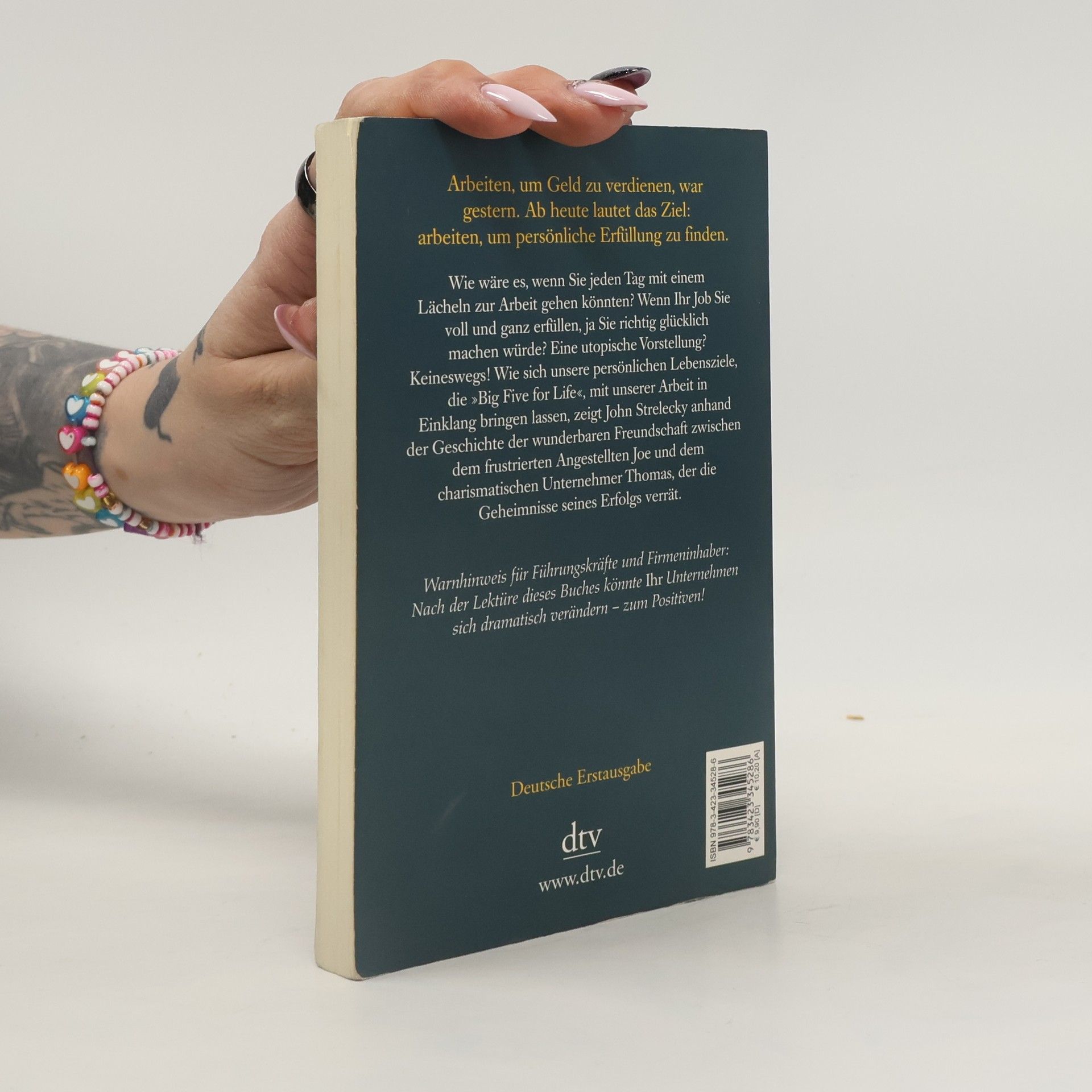 Arbeiten, um Geld zu verdienen, war gestern Durch Zufall lernt Joe, ein mit seinem Job unzufriedener Angestellter, den charismatischen Geschäftsmann Thomas kennen. Rasch entwickelt sich eine tiefe Freundschaft zwischen den beiden Männern. Thomas wird zu Joes Mentor und offenbart ihm die Geheimnisse seines Erfolgs. Er zeigt Joe, wie wichtig es ist, auch in der Arbeit erfüllt zu sein. Seine Unternehmen führt Thomas anhand zweier Leitlinien: Jeder Mitarbeiter muss seine Bestimmung sowie seine »Big Five for Life« kennen, also wissen, welche fünf Ziele er im Leben erreichen will. Diese Ideen helfen Joe, seine Wünsche zu verwirklichen. Doch Thomas will möglichst viele an seinem Wissen teilhaben lassen: Seine gesammelten Aufzeichnungen liegen hier vor Ihnen. Arbeiten, um Geld zu verdienen, war gestern. Ab heute lautet das Ziel: arbeiten, um persönliche Erfüllung zu finden.