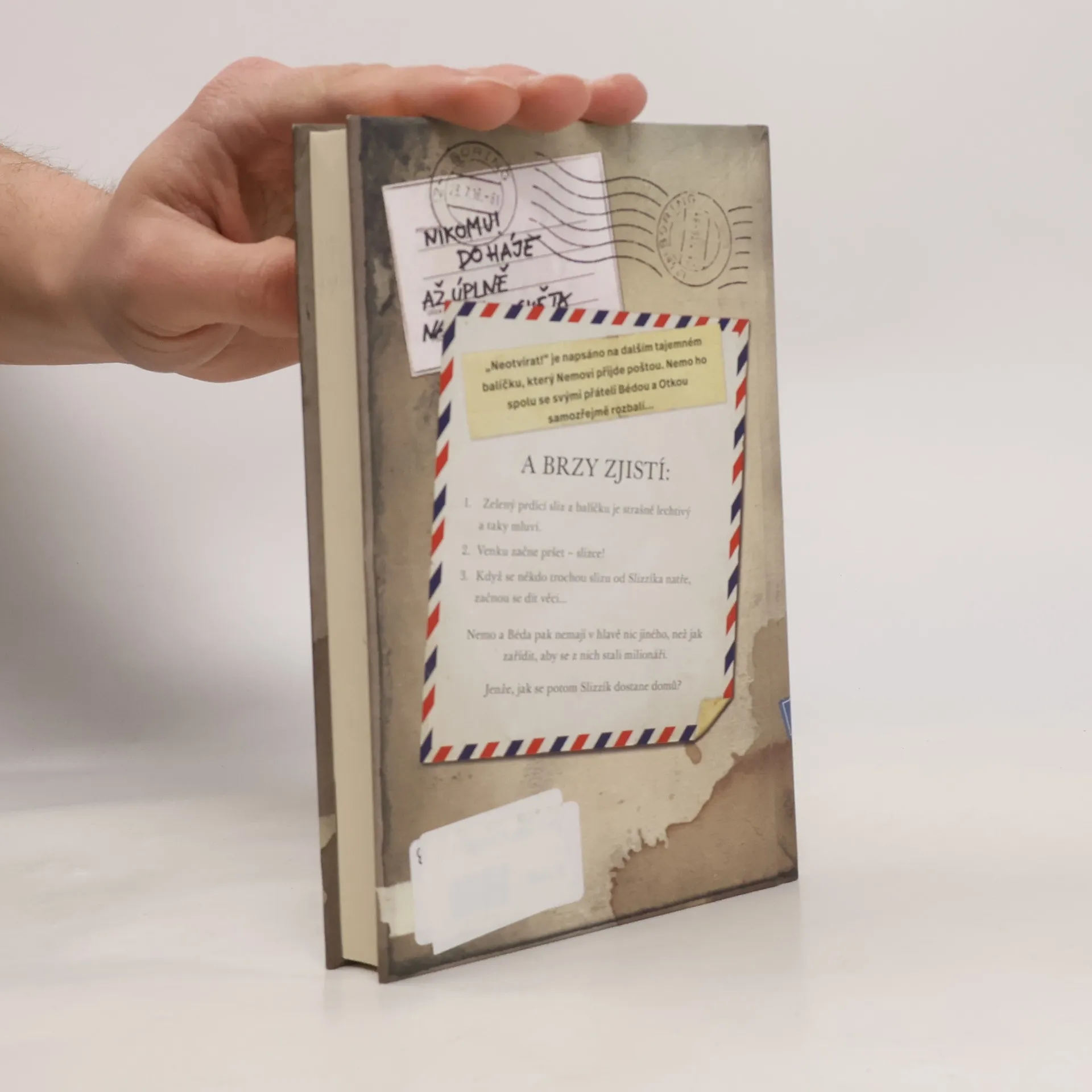Už zase! Nemovi přišel poštou další balíček s nápisem Neotvírat! Pod něj někdo připsal ještě jedno varování − Slizké! Co to jen může být? Nemo a jeho přátelé Béda a Otka neodolají a balíček tajně otevřou. Najdou v něm zelený sliz, který nejenže mluví a je strašně lechtivý, ale zdá se, že má i další, skoro zázračné schopnosti. Nemo a Béda začnou okamžitě snít o tom, že z nich budou milionáři. Podaří se jim to? Stane se ale ještě něco. Rázem se změní počasí, slizký liják zaplaví celý Suchopár a někteří lidé začnou mít problém! Naši tři přátelé vědí, že pokud Slizzíka nevrátí, kam patří, nastane úplná katastrofa. Pustí se tedy do hledání. Jak celé dobrodružství plné napětí a neuvěřitelných příhod dopadne? Co udělají naší známí ze Suchopáru? Podaří se jim město i zelenou příšerku zachránit? Vtipné a milé vyprávění, ve kterém jde v prvé řadě o přátelství, potěší všechny, kteří rádi čtou. Třeba před spaním?