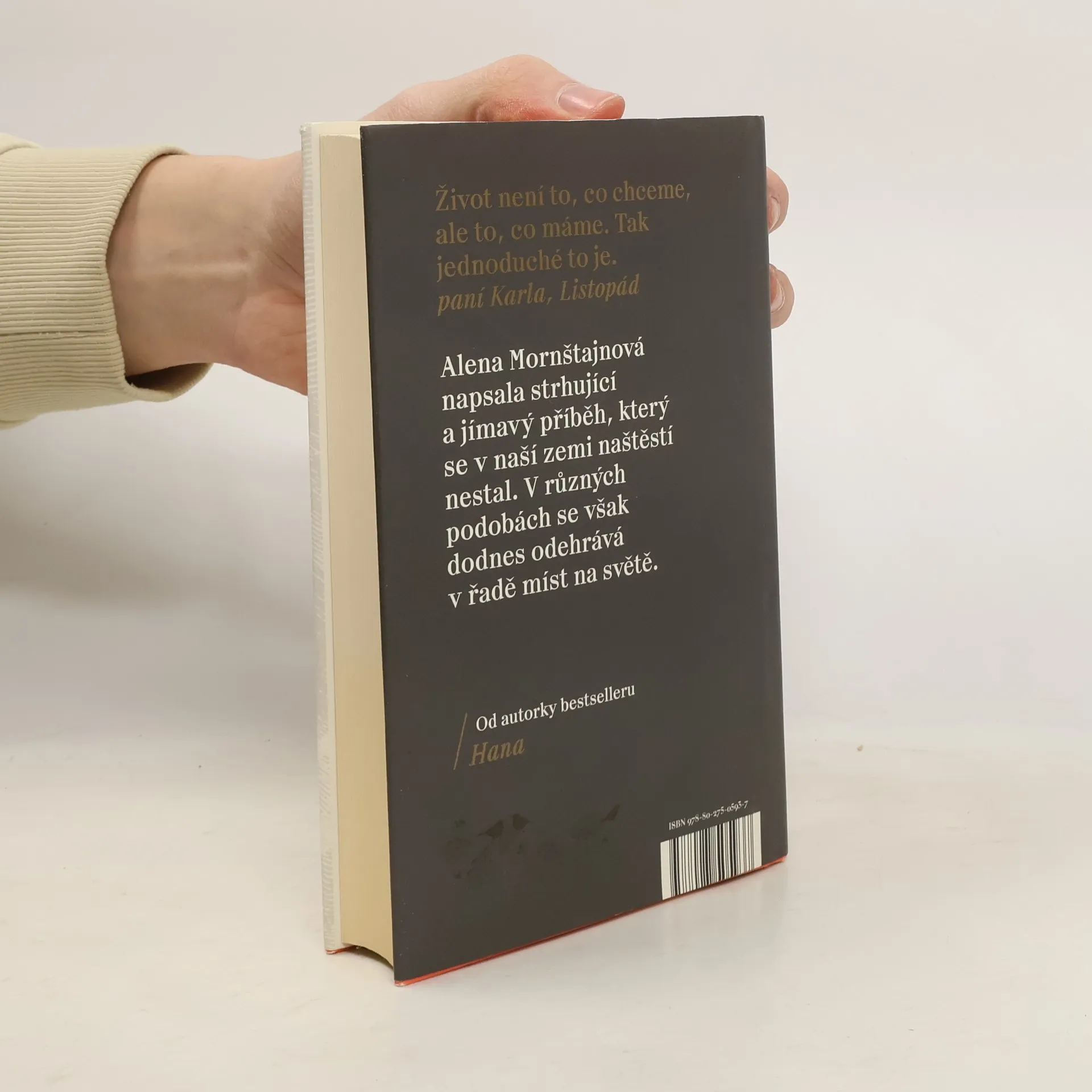 Zeptali jste se někdy sami sebe, jaký by asi byl váš život, kdyby to v listopadu 1989 dopadlo všechno úplně jinak? Jaké by asi byly naše osudy, kdyby komunismus neskončil a my bychom zůstali za železnou oponou oddělující nás od světa i jeden od druhého? Jedna z nejúspěšnějších českých spisovatelek Alena Mornštajnová opět překvapuje; její nový román je dramatickým příběhem obyčejné rodiny, kterou velké dějiny během jedné listopadové noci rozdělí a postaví proti sobě. Sledujeme příběh Marie Hajné, která je kvůli účasti na demonstracích zatčena a odsouzena ke dvaceti letům vězení. Ví, že už nejspíš nikdy neuvidí vyrůstat své děti, a při životě ji udržují jen dopisy. A taky naděje, že se nakonec přece jen shledají... Vedle toho se odvíjí příběh dívenky Magdaleny, která je odebrána rodičům a umístěna do „ozdravovny“, ve které se vychovávají nové komunistické kádry. Jejich osudy se jednoho dne protnou, ale zcela jinak, než si obě představovaly a přály.