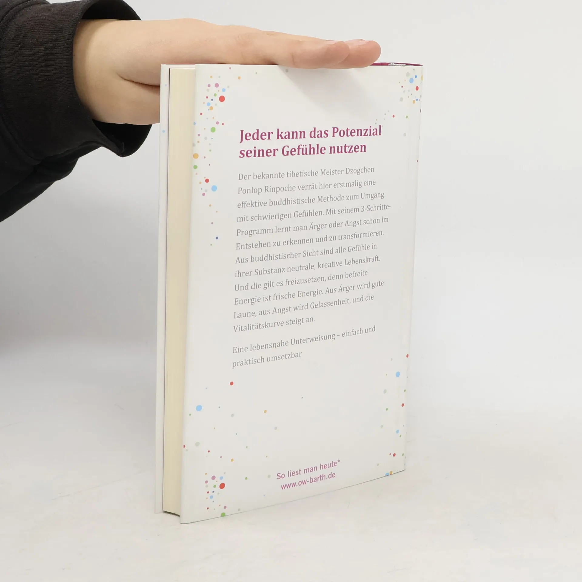 Der bekannte tibetische Meister Dzogchen Ponlop Rinpoche verrät hier erstmalig eine effektive buddhistische Technik zum Umgang mit schwierigen Gefühlen. Mit seinem 3-Schritte-Programm lernt man Ärger oder Angst schon im Entstehen zu erkennen und zu transformieren. Aus buddhistischer Sicht sind alle Gefühle in ihrer Substanz neutrale, kreative Lebenskraft. Und die gilt es freizusetzen, denn befreite Energie ist frische Energie. Aus Ärger wird gute Laune, aus Angst wird Gelassenheit, und die Vitalitätskurve steigt an. Seit Tausenden von Jahren beobachten die Tibeter die Regungen des menschlichen Geistes und Herzens. Von diesen Erfahrungen können moderne westliche Menschen profitieren. Egal, ob Sie nur unter leichtem Gefühlschaos leiden oder einem gewaltigen inneren Aufruhr ausgesetzt sind: Sie selbst besitzen die Macht, um sich von verwirrenden Emotionen zu befreien. Der Kern dieser Praxis besteht zunächst darin, seine Gefühle von Beginn an vollkommen klar wahrzunehmen und seine Achtsamkeit darin massiv zu erhöhen. Aus diesem inneren Abstand heraus gelingt es dann mit einfachen meditativen Techniken, seinen Körper und seinen Geist in die Gefühle hinein zu entspannen. Und erst jetzt offenbart sich das ursprüngliche kreative Potenzial unserer Emotionen, und Sie schenken sich selbst eine große Portion zusätzlicher Lebenskraft und Freude, wenn Sie sich wieder wieder Zugang zu dieser Quelle verschaffen.