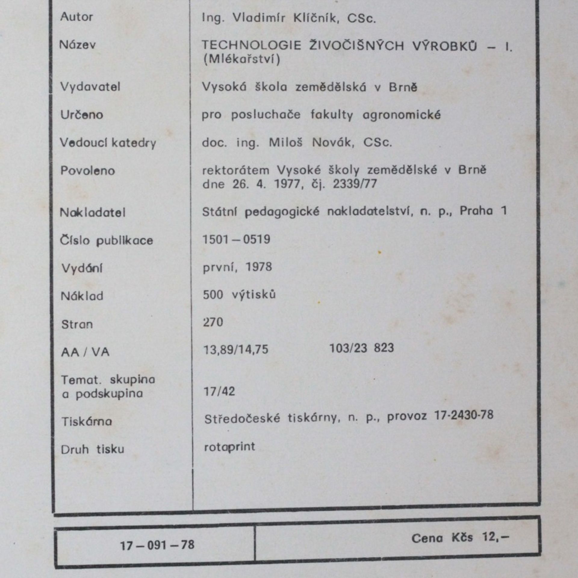 Technologie živočišných výrobků : Určeno pro posl. fak. agronomické. 1. [díl], Mlékařství, Vladimír Klíčník
