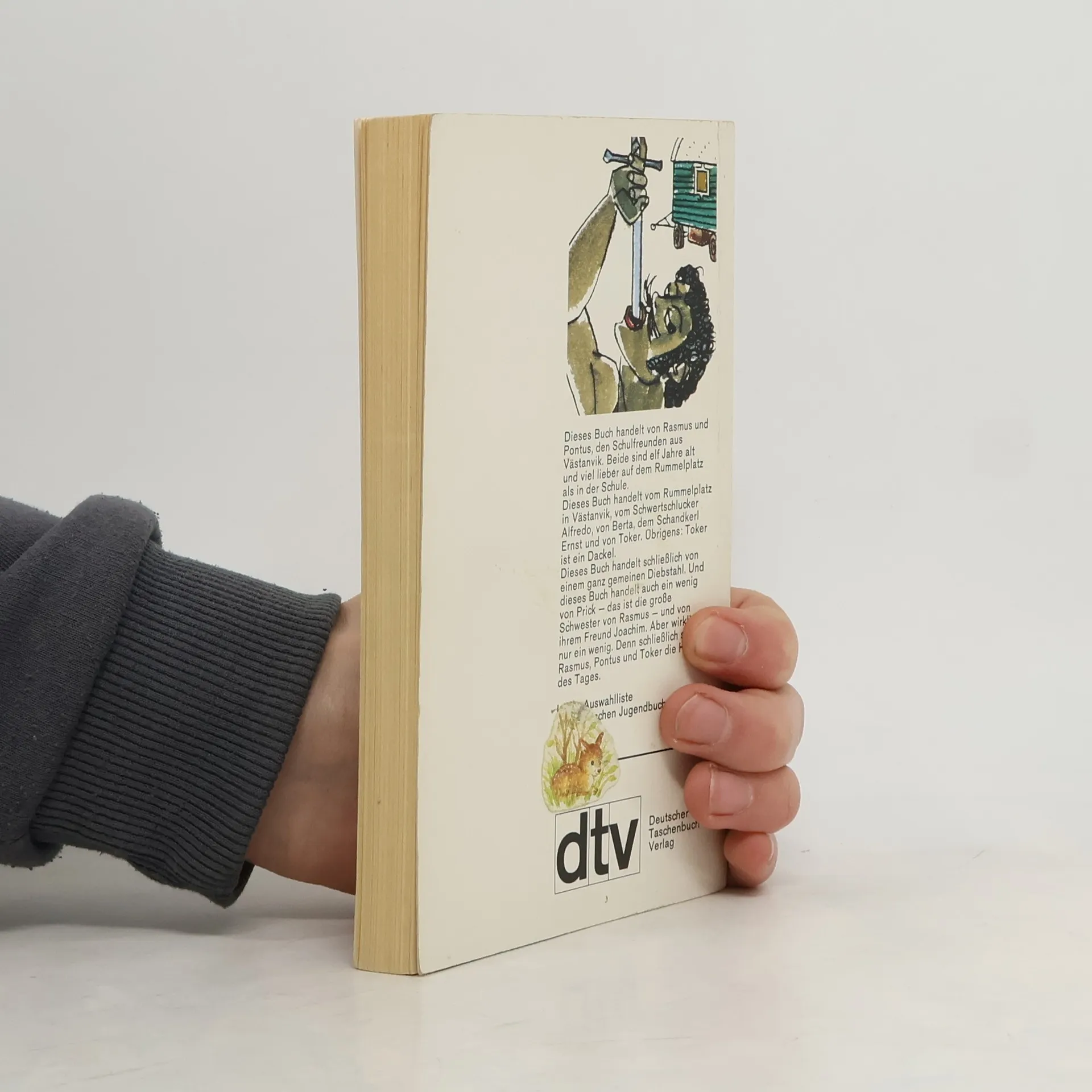 Dieses Buch handelt von Rasmus und Pontus, den Schulfreunden aus Västanvik. Beide sind elf Jahre alt und viel lieber auf dem Rummelplatz als in der Schule. Dieses Buch handelt vom Rummelplatz in Västanvik, vom Schwertschlucker Alfredo, von Berta, dem Schandkerl Ernst und von Toker. Übrigens: Toker ist ein Dackel. Dieses Buch handelt schließlich von einem ganz gemeinen Diebstahl. Und dieses Buch handelt auch ein wenig von Prick - das ist die große Schwester von Rasmus - und von ihrem Freund Joachim. Aber wirklich nur ein wenig. Denn schließlich sind Rasmus, Pontus und Toker die Helden des Tages. Auswahlliste Deutscher Jugendliteraturpreis
