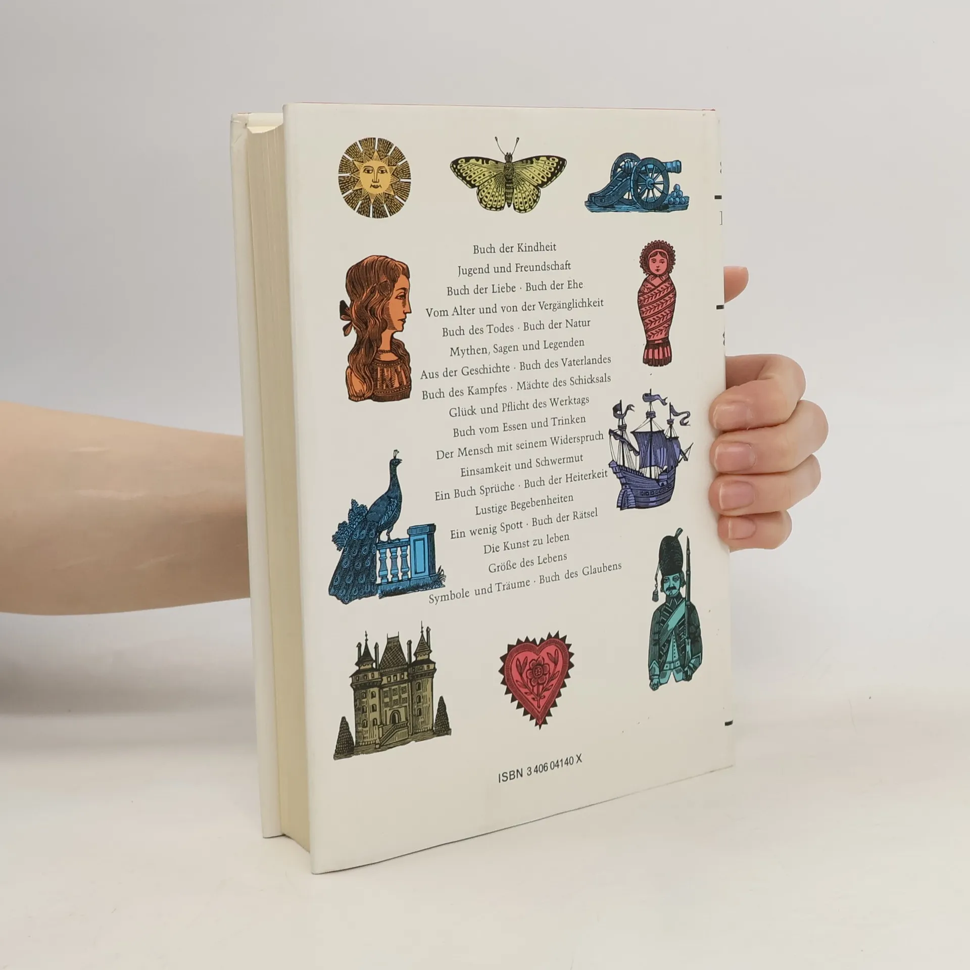 Buch der Kindheit - Jugend und Freundschaft - Buch der Liebe - Buch der Ehe - Vom Alter und von der Vergänglichkeit - Buch des Todes - Buch der Natur - Mythen, Sagen und Legenden - Aus der Geschichte - Buch des Vaterlandes - Buch des Kampfes - Mächte des Schicksals - Glück und Pflicht des Werktags - Buch vom Essen und Trinken - Der Mensch mit seinem Widerspruch - Einsamkeit und Schwermut - Ein Buch Sprüche - Buch der Heiterkeit - Lustige Begebenheiten - Ein wenig Spott - Buch der Rätsel - Die Kunst zu leben - Größe des Lebens - Symbole und Träume - Buch des Glaubens