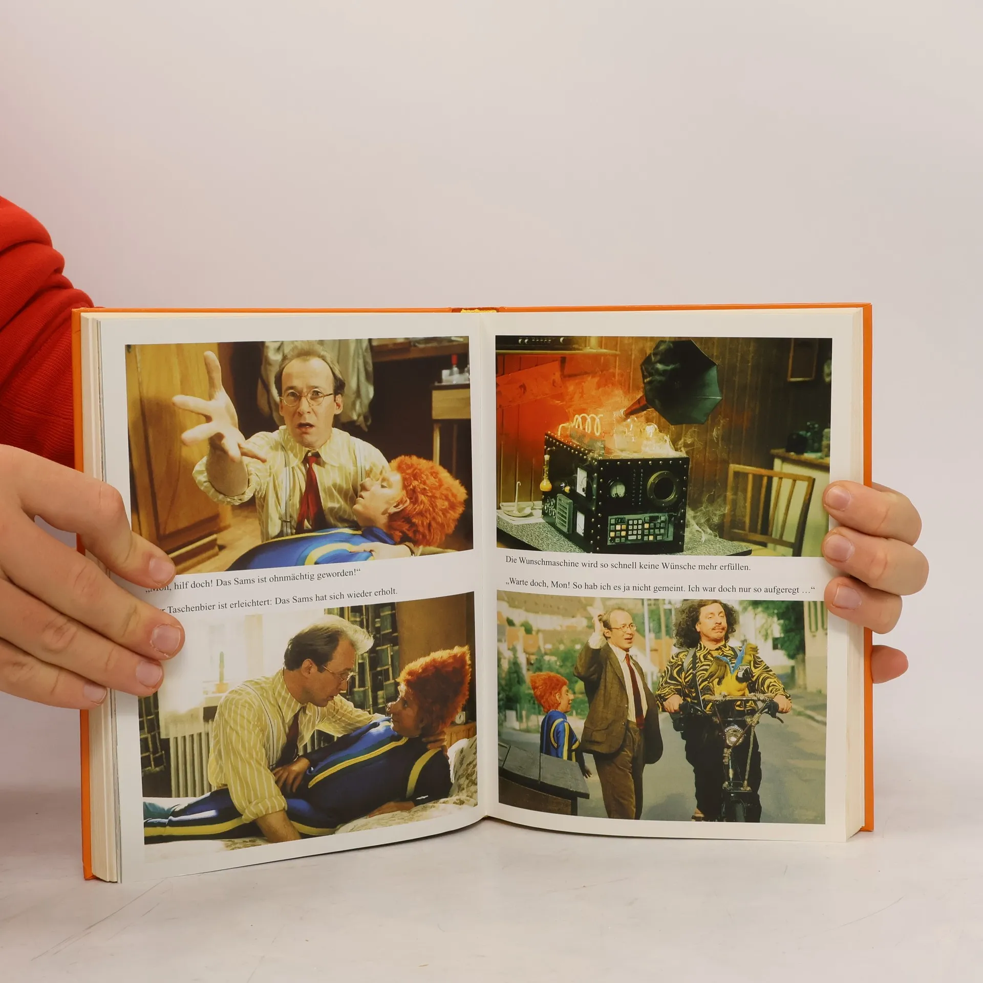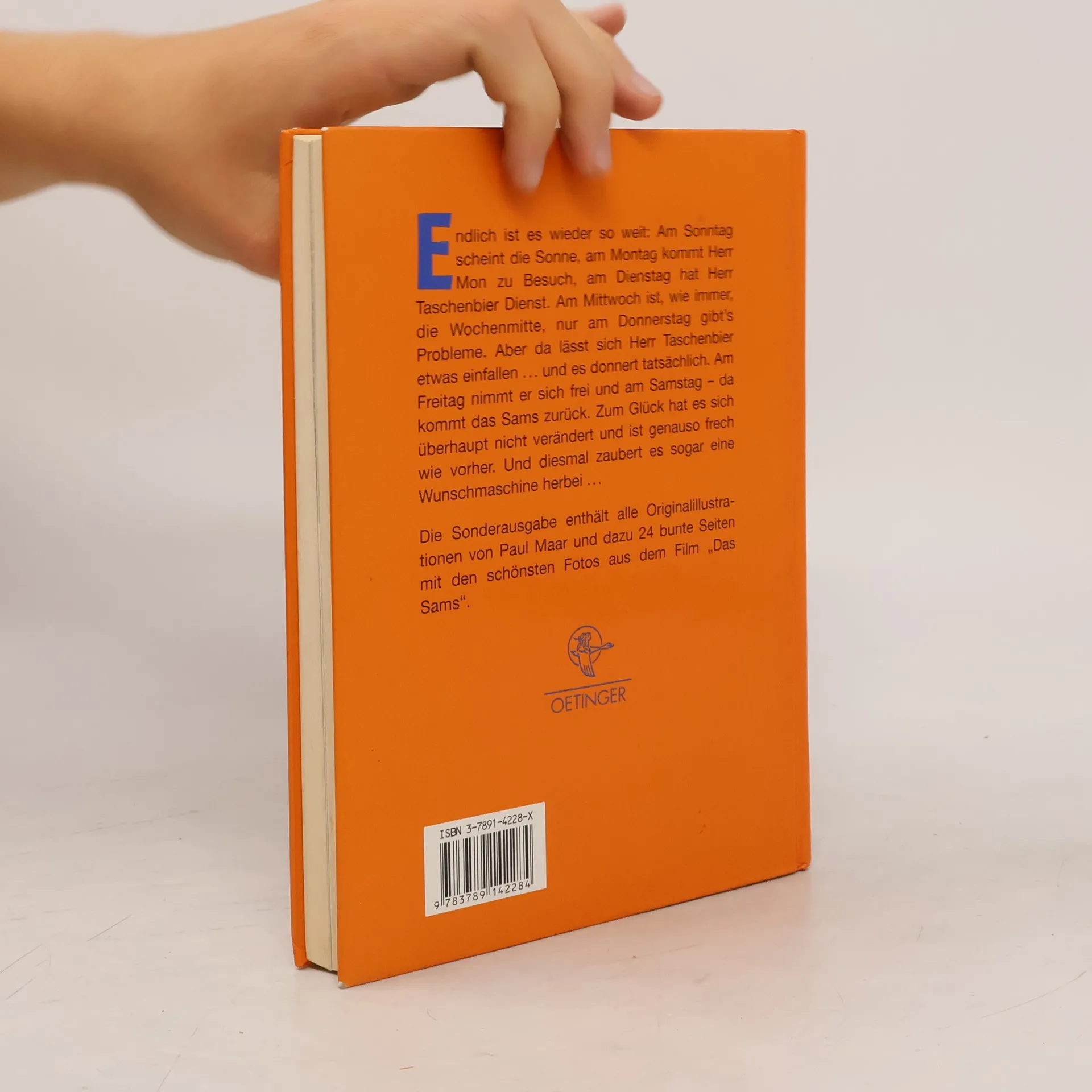 Endlich ist es wieder so weit: Am Sonntag scheint die Sonne, am Montag kommt Herr Mon zu Besuch, am Dienstag hat Herr Taschenbier Dienst. Am Mittwoch ist, wie immer, die Wochenmitte, nur am Donnerstag gibt's Probleme. Aber da lässt sich Herr Taschenbier etwas einfallen. und es donnert tatsächlich. Am Freitag nimmt er sich frei und am Samstag - da kommt das Sams zurück. Zum Glück hat es sich überhaupt nicht verändert und ist genauso frech wie vorher. Und diesmal zaubert es sogar eine Wunschmaschine herbei. Die Sonderausgabe enthält alle Originalillustrationen von Paul Maar und dazu 24 bunte Seiten mit den schönsten Fotos aus dem Film „Das Sams“.