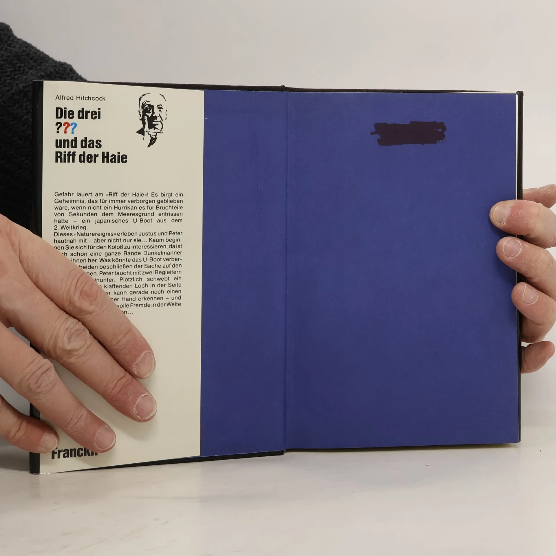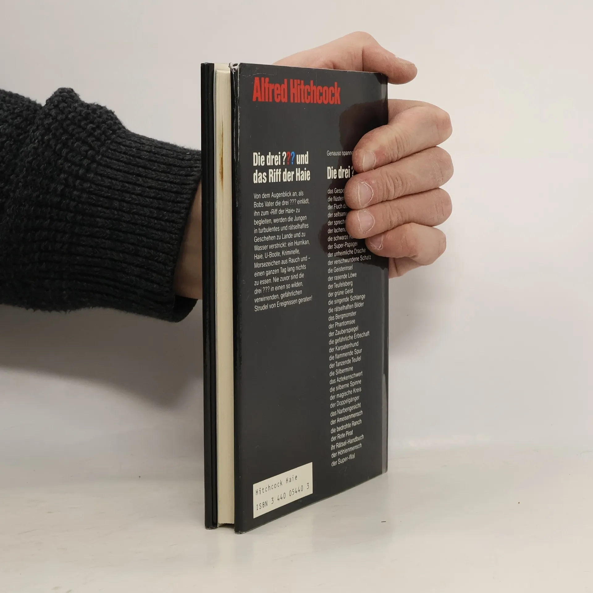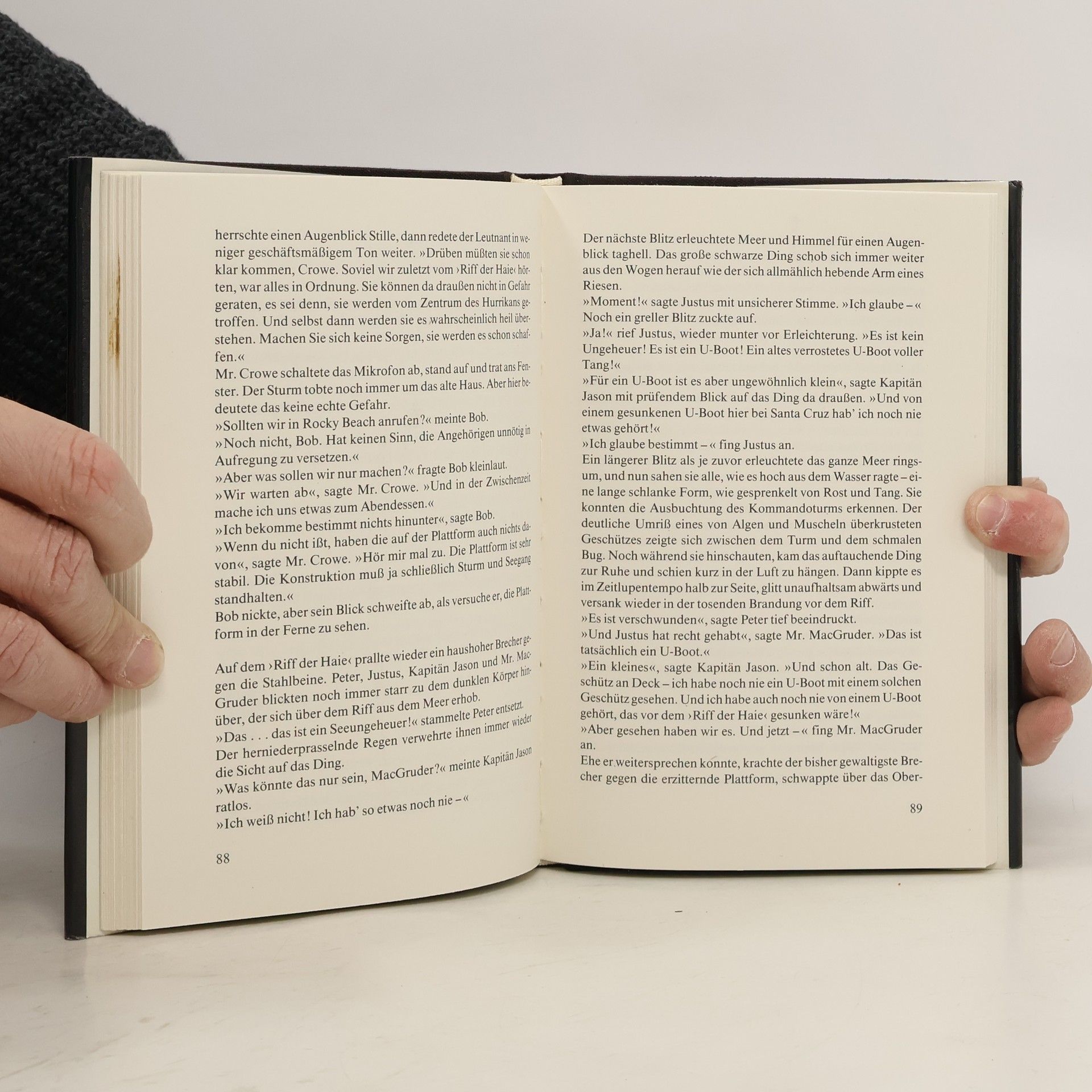 Noch nie zuvor sind die drei ??? in einen so verwirrenden, gefährlichen Strudel von Ereignissen geraten! Schauplatz der Handlungen: das ›Riff der Haie‹ vor der kalifornischen Küste. Die drei jugendlichen Detektive Justus, Peter und Bob, mitten auf dem Meer von einem Hurrican überrascht, werden Zeugen einer geisterhaften Erscheinung: Wie ein Meeresungetüm taucht ein verrostetes japanisches U-Boot aus den Wellen auf. Doch bald schon interessieren sich auch andere, höchst rätselhafte Leute für das Wrack...