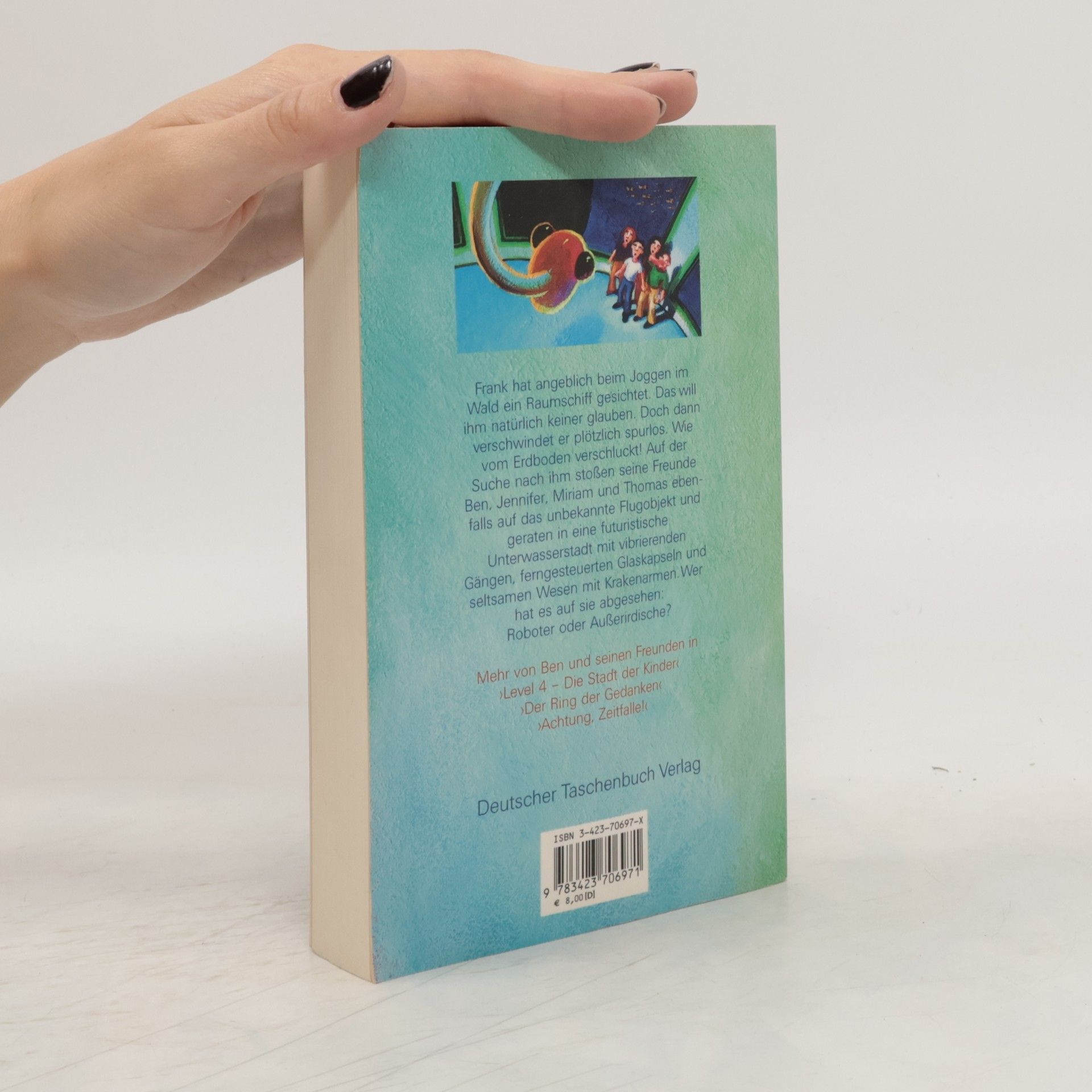 Frank hat angeblich beim Joggen im Wald ein Raumschiff gesichtet. Das will ihm natürlich keiner glauben. Doch dann verschwindet er plötzlich spurlos. Wie vom Erdboden verschluckt! Auf der Suche nach ihm stoßen seine Freunde Ben, Jennifer, Miriam und Thomas ebenfalls auf das unbekannte Flugobjekt und geraten in eine futuristische Unterwasserstadt mit vibrierenden Gängen, ferngesteuerten Glaskapseln und seltsamen Wesen mit Krakenarmen. Wer hat es auf sie abgesehen: Roboter oder Außerirdische?