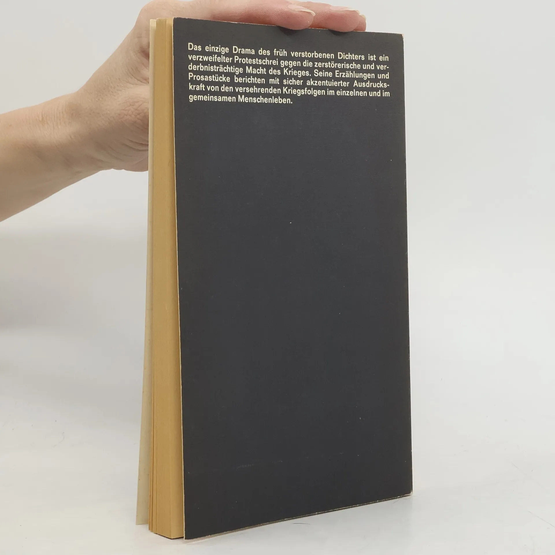 Das einzige Drama des früh verstorbenen Dichters ist ein verzweifelter Protestschrei gegen die zerstörerische und verderbnisträchtige Macht des Krieges. Seine Erzählungen und Prosastücke berichten mit sicher akzentuierter Ausdruckskraft von den verheerenden Kriegsfolgen im einzelnen und im gemeinsamen Menschenleben.
