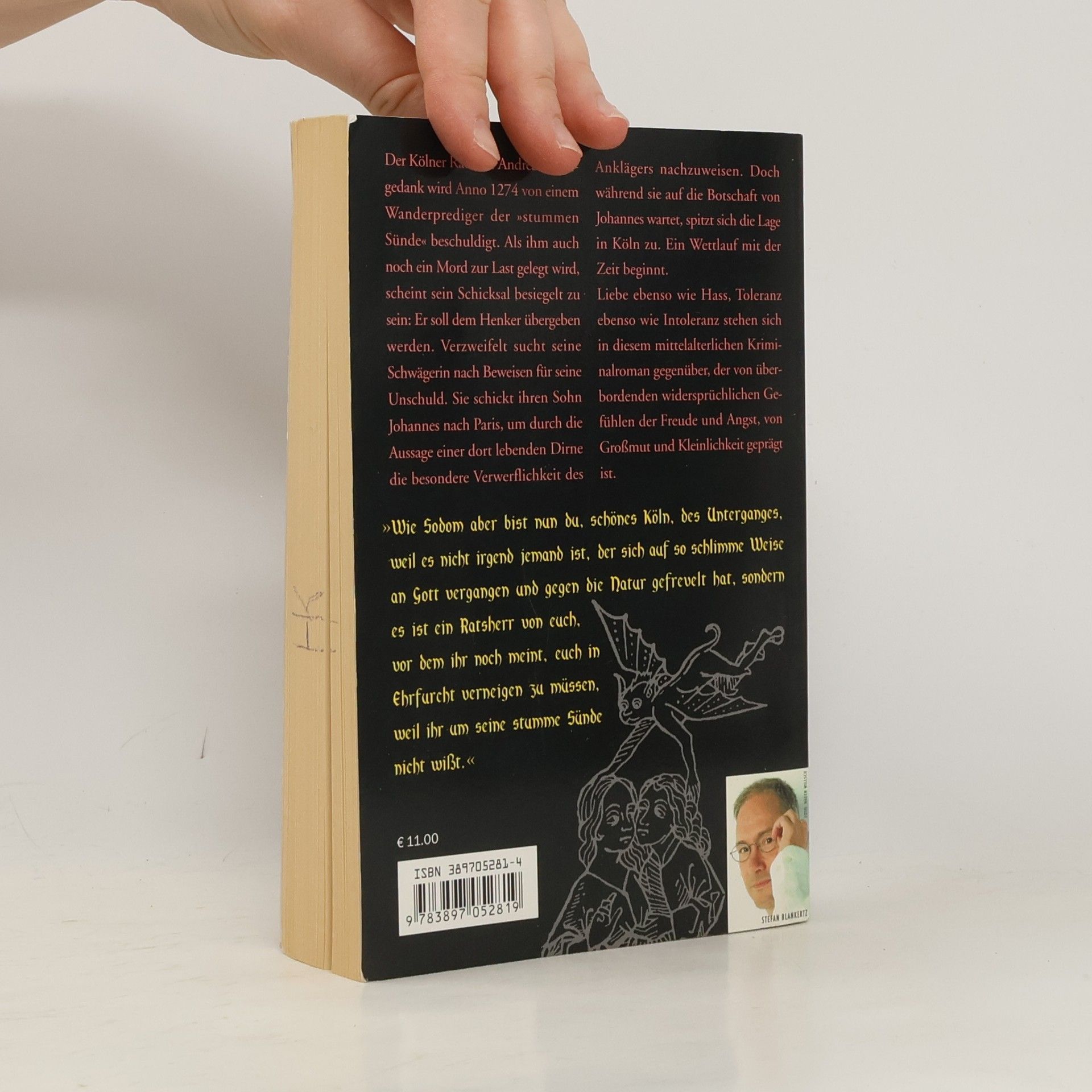 Der Kölner Ratsherr Andreas Kleingedank wird Anno 1274 von einem Wanderprediger der „stummen Sünde“ beschuldigt, d. h. der Homosexualität. Als Andreas auch noch ein Mord zur Last gelegt wird, scheint sein Schicksal besiegelt zu sein: Er soll dem Henker übergeben werden. Verzweifelt sucht die Schwägerin des Angeklagten in Köln nach Beweisen für die Unschuld von Andreas. Ihren Sohn Johannes, einen jungen weit gereisten Dominikanermönch, schickt sie derweil auf den langen und gefährlichen Weg nach Paris, um dort eine wichtige Zeugin aufzusuchen. Doch während er auf der abenteuerlichen Wanderung nach Paris darüber nachgrübelt und allerlei Ungemach zu überwinden hat, spitzt sich die Lage in Köln dramatisch zu. Ein Wettlauf mit der Zeit beginnt. Liebe ebenso wie Hass, Toleranz ebenso wie Intoleranz im 13. Jahrhundert werden in diesem historischen Roman lebendig. Der Leser wird in das bunte Treiben einer vergangenen Zeit entführt, die von überbordenden widersprüchlichen Gefühlen der Freude und Angst, der Großmut und Kleinlichkeit geprägt ist.