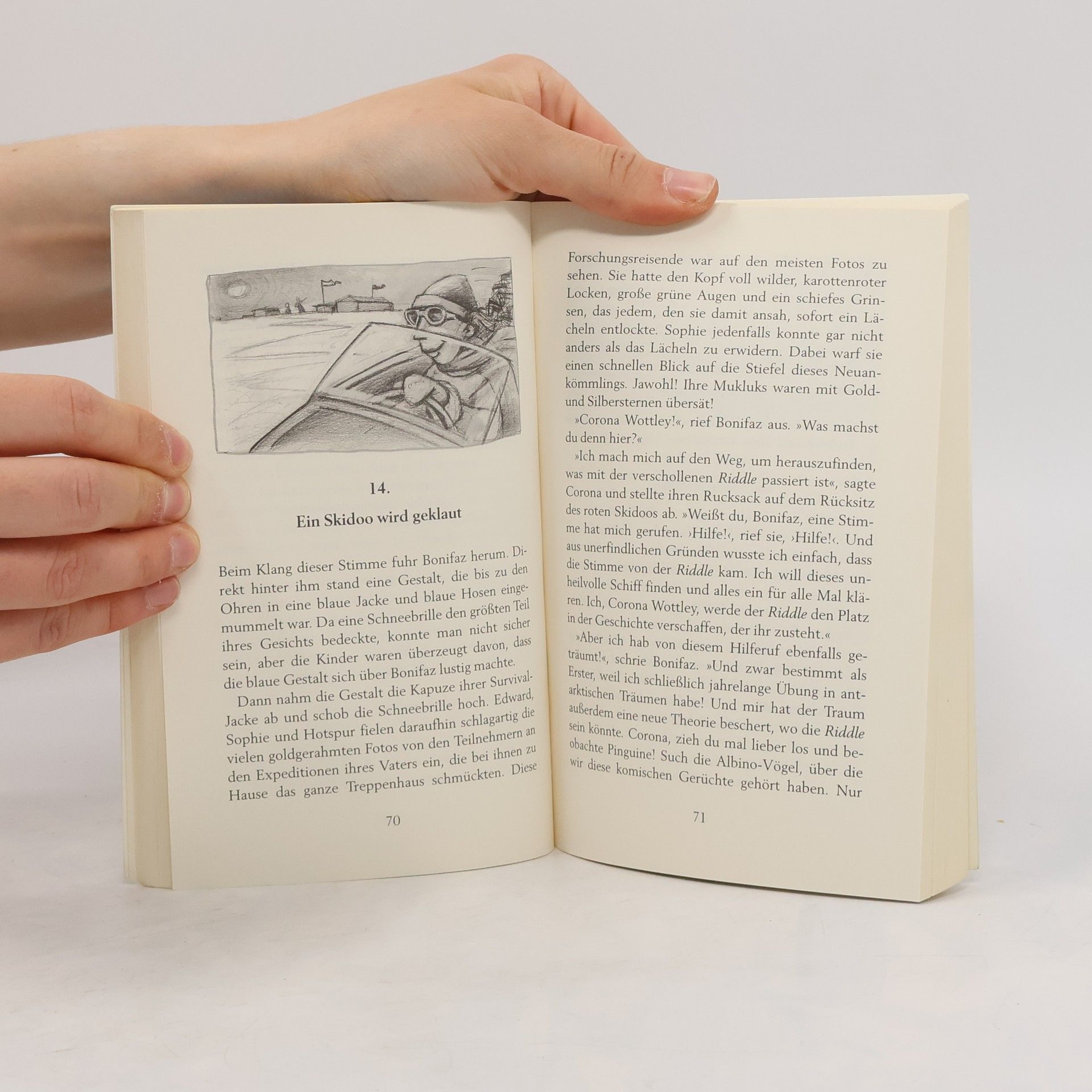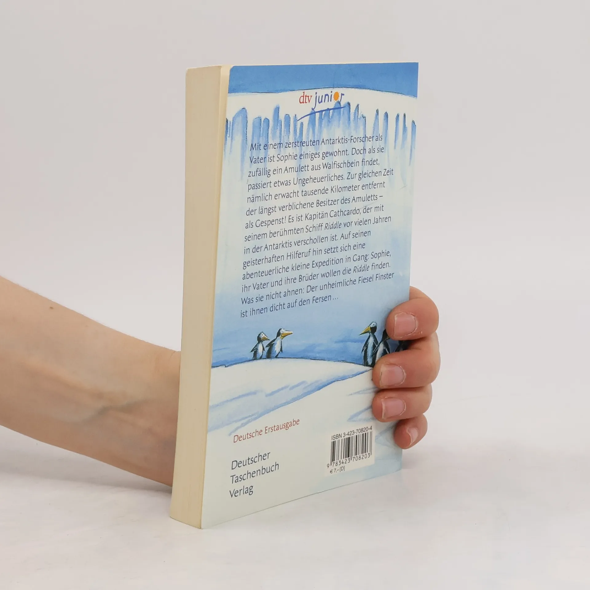 Mit einem zerstreuten Antarktis-Forscher als Vater ist Sophie einiges gewohnt. Doch als sie zufällig ein Amulett aus Walfischbein findet, passiert etwas Ungeheuerliches. Zur gleichen Zeit nämlich erwacht tausende Kilometer entfernt der längst verblichene Besitzer des Amuletts – als Gespenst! Es ist Kapitän Cathcardo, der mit seinem berühmten Schiff Riddle vor vielen Jahren in der Antarktis verschollen ist. Auf seinen geisterhaften Hilferuf hin setzt sich eine abenteuerliche kleine Expedition in Gang: Sophie, ihr Vater und ihre Brüder wollen die Riddle finden. Was sie nicht ahnen: Der unheimliche Fiesel Finster ist ihnen klammheimlich auf den Fersen …