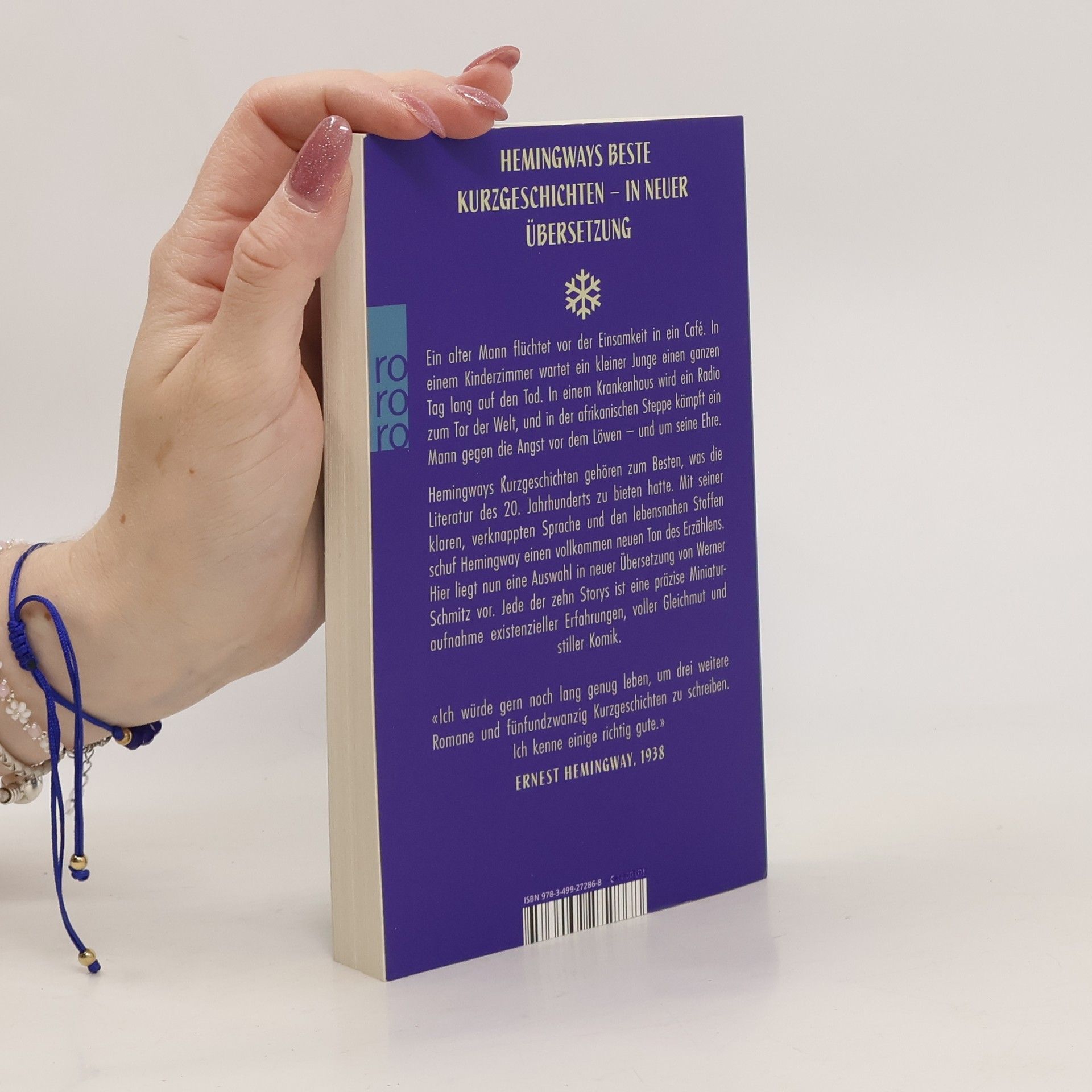 Hemingways beste Kurzgeschichten – in neuer Übersetzung. Ein alter Mann flüchtet vor der Einsamkeit in ein Café. In einem Kinderzimmer wartet ein kleiner Junge einen ganzen Tag lang auf den Tod. In einem Krankenhaus wird ein Radio zum Tor der Welt, und in der afrikanischen Steppe kämpft ein Mann gegen die Angst vor dem Löwen – und um seine Ehre. Hemingways Kurzgeschichten gehören zum Besten, was die Literatur des 20. Jahrhunderts zu bieten hatte. Mit seiner klaren, verknappten Sprache und den lebensnahen Stoffen schuf Hemingway einen vollkommen neuen Ton des Erzählens. Hier liegt nun eine Auswahl in neuer Übersetzung von Werner Schmitz vor. Jede der zehn Storys ist eine präzise Miniaturaufnahme existentieller Erfahrungen, voller Gleichmut und stiller Komik. «Ich würde gern noch lang genug leben, um drei weitere Romane und fünfundzwanzig Kurzgeschichten zu schreiben. Ich kenne einige richtig gute.» (Ernest Hemingway, 1938)