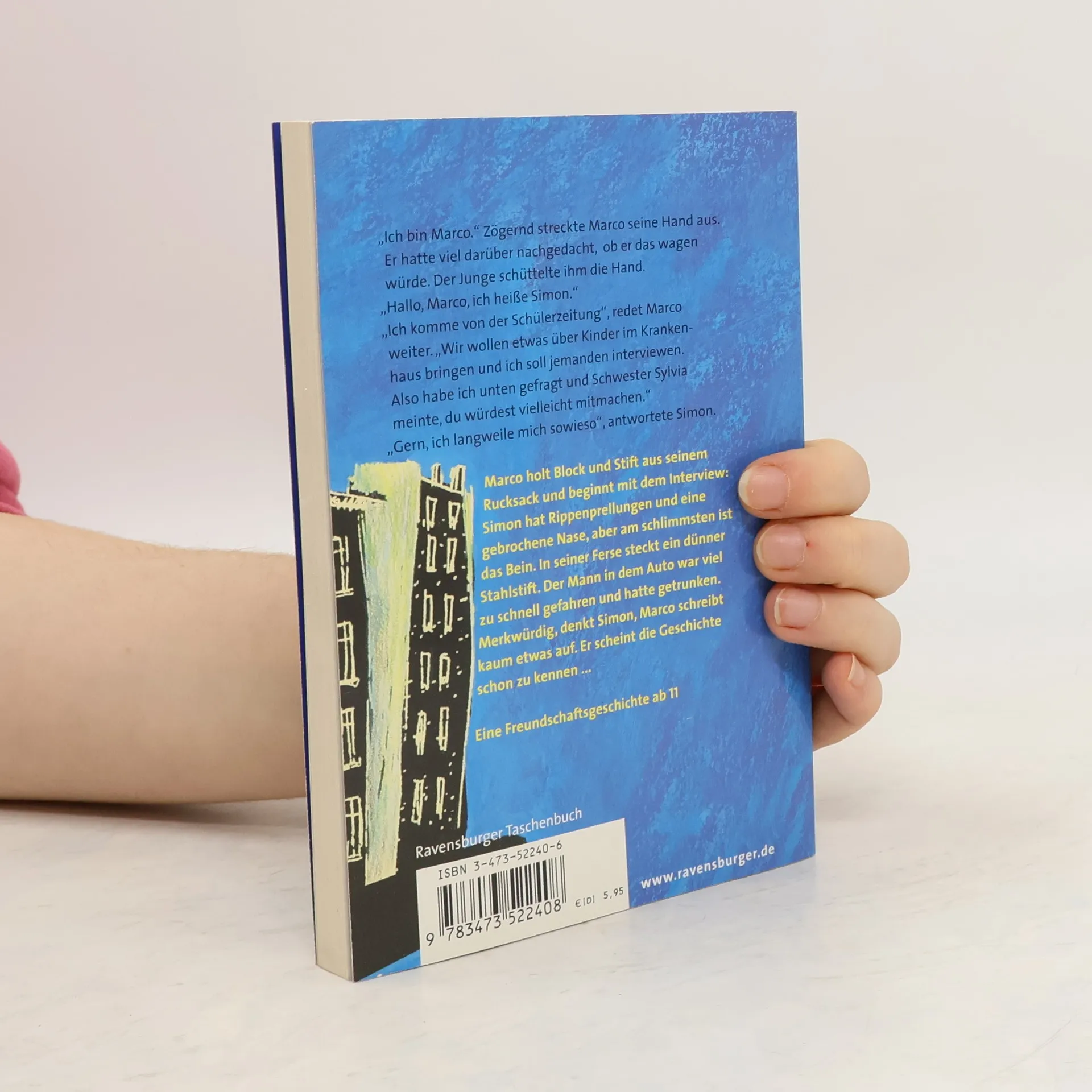 Simon liegt mit Rippenprellungen und einem Stahlstift in der Ferse im Krankenhaus. Der Mann, der ihn angefahren hat, hatte zu viel getrunken. Unter dem Vorwand für die Schülerzeitung zu schreiben, beginnt Marco Simon zu besuchen. Die Jungen verstehen sich prima. Als Simon erfährt, dass Marcos alkoholkranker Vater den Unfall verursacht hat, fühlt Simon sich getäuscht. Eine Aussprache zwischen den Jungen wird notwendig.
