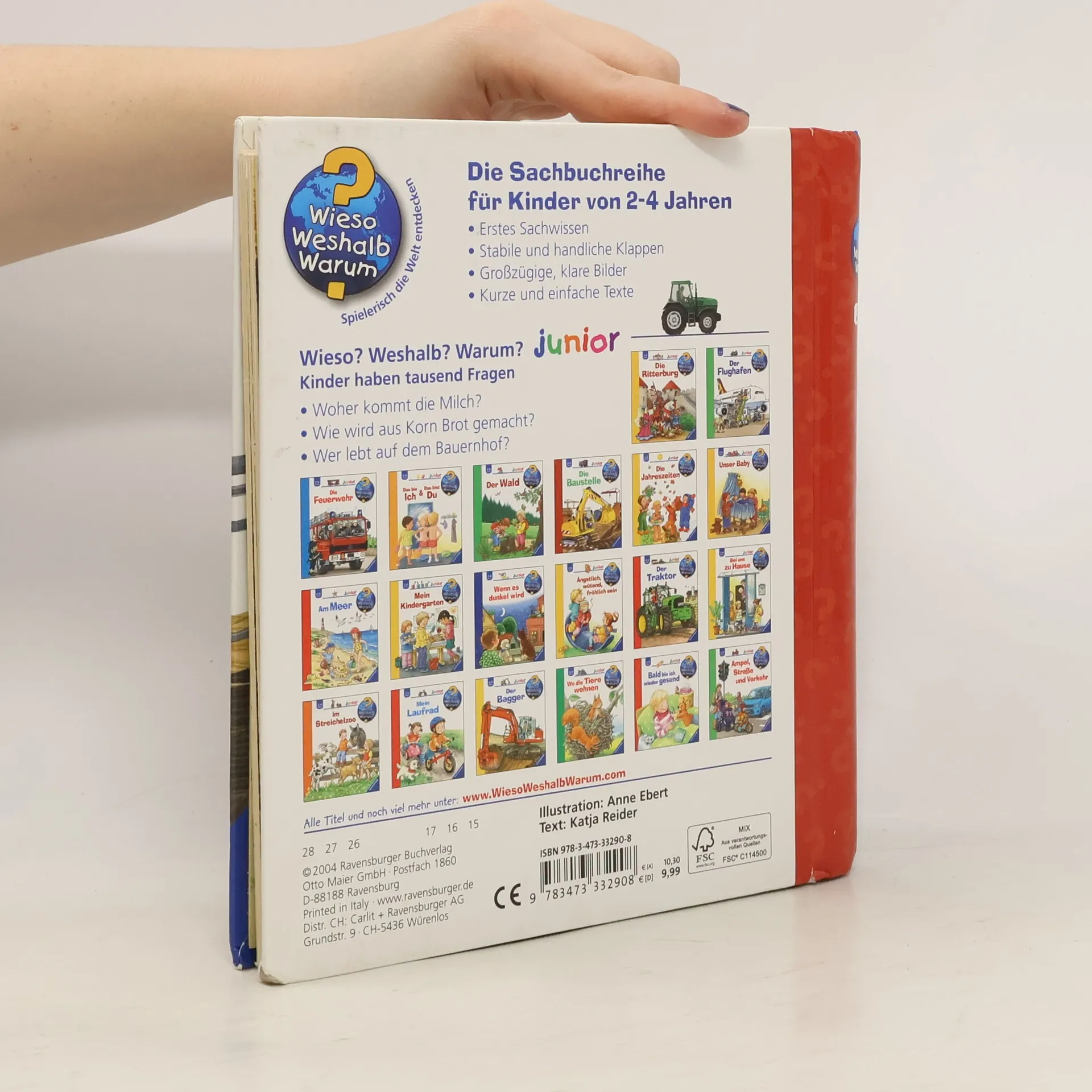 Mit dem Traktor fahren wir über die Felder zum Bauernhof. Dort erkunden Kinder die Gebäude und besuchen verschiedene Tiere im Stall und auf der Weide. Dabei finden sie Antworten auf ihre Fragen: Woher kommt unsere Milch? Wie wächst das Getreide? Warum werden Schafe geschoren? Mit Klappen lassen Kinder ein Küken schlüpfen und helfen dem Bauern beim Melken oder bei der Ernte. Eine Entdeckungsreise zum Bauernhof für Kinder ab 2 Jahren. Wieso? Weshalb? Warum? junior Die Sachbuchreihe für Kinder von 2-4 Jahren Jeden Tag entdecken Kinder etwas Neues – und haben viele Fragen. Wann kommt die Feuerwehr? Was machen die Tiere im Winter? Warum muss ich Zähne putzen? Die beliebte Sachbuchreihe Wieso? Weshalb? Warum? junior beantwortet die Fragen der Kinder auf Augenhöhe. Sie beleuchtet unterschiedlichste Themen aus ihrer Alltags- und Interessenswelt altersgerecht und mit viel Liebe zum Detail. Die Reihe ist speziell auf kleine Hände und die Bedürfnisse der Kleinsten angepasst. Klare und liebevolle Bilder, kurze Sachtexte sowie handliche Klappen, die Bewegungen veranschaulichen und überraschende und lustige Einblicke gewähren, ermöglichen Kindern, sich ihre Themen selbst zu erschließen. Der Spaß am eigenhändigen Entdecken, die liebevolle Umsetzung und die hochwertige Ausstattung garantieren langanhaltende Freude an jedem Buch.