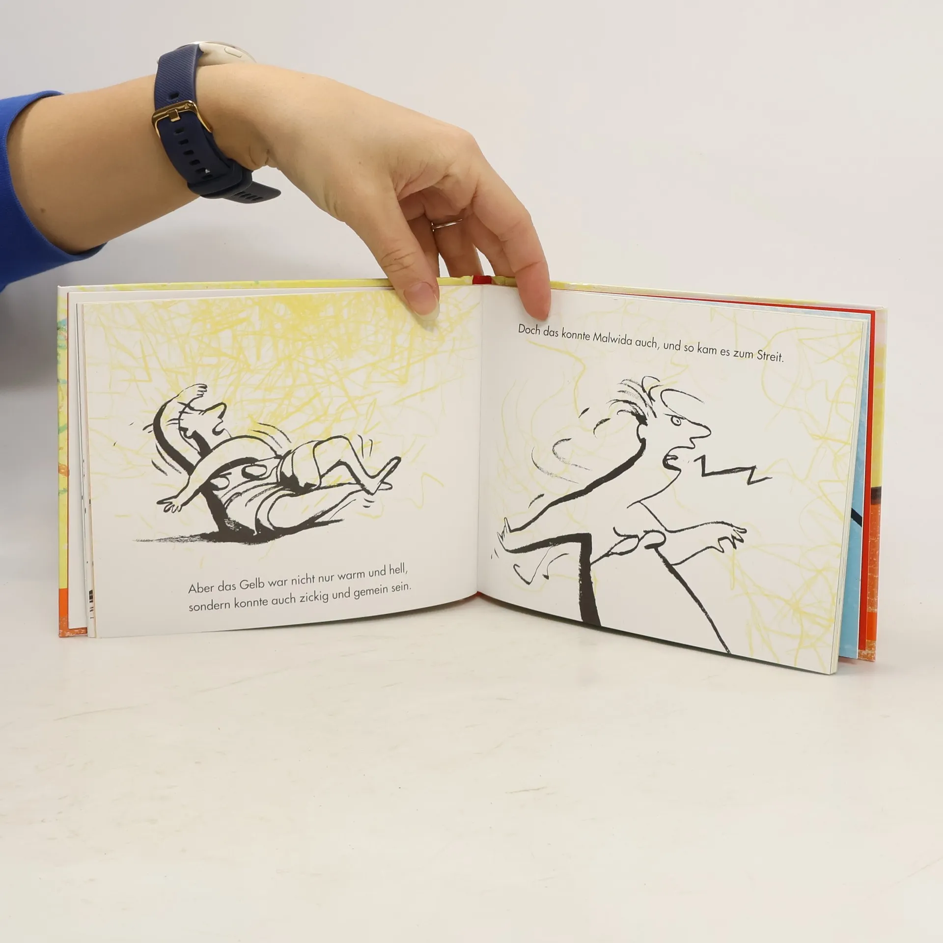 In poetischen Tönen erzählt Jutta Bauer von der Königin Malwida und ihren Untertanen Blau, Rot und Gelb. Ein Bilderbuch für alle, die wissen wollen, wie die Farben wirklich sind. (Und wie sie sich miteinander vertragen.) Wenn Malwida, die Königin, ihre Untertanen ruft, kommt erst das Blau, es ist sanft und mild. Dann kommt das Rot, es ist wild und gefährlich. Und zum Schluss das Gelb, es ist so schön warm und hell, aber es kann auch zickig und gemein sein. Wie Malwida selbst. Und wenn sie es beide sind, kommt es zum Streit. Dann wird alles grau. Auch Malwida wird grau und - traurig. Und sie ist keine Königin der Farben mehr. Deshalb muss sie weinen. Ihre Tränen aber sind blau und gelb und rot. Bald legt sich das sanfte Blau wieder über das Königreich. Jutta Bauer erzählt eine einfache Geschichte in Bildern und Worten, die dennoch das ganze wunderbare Zusammenspiel der Farben erklärt. Die Königin der Farben wurde zunächst als Fernsehfilm produziert. Jutta Bauer und Katrin Magnitz wurden dafür mit dem EMIL, dem „Preis für gutes Kinderfernsehen“, ausgezeichnet.