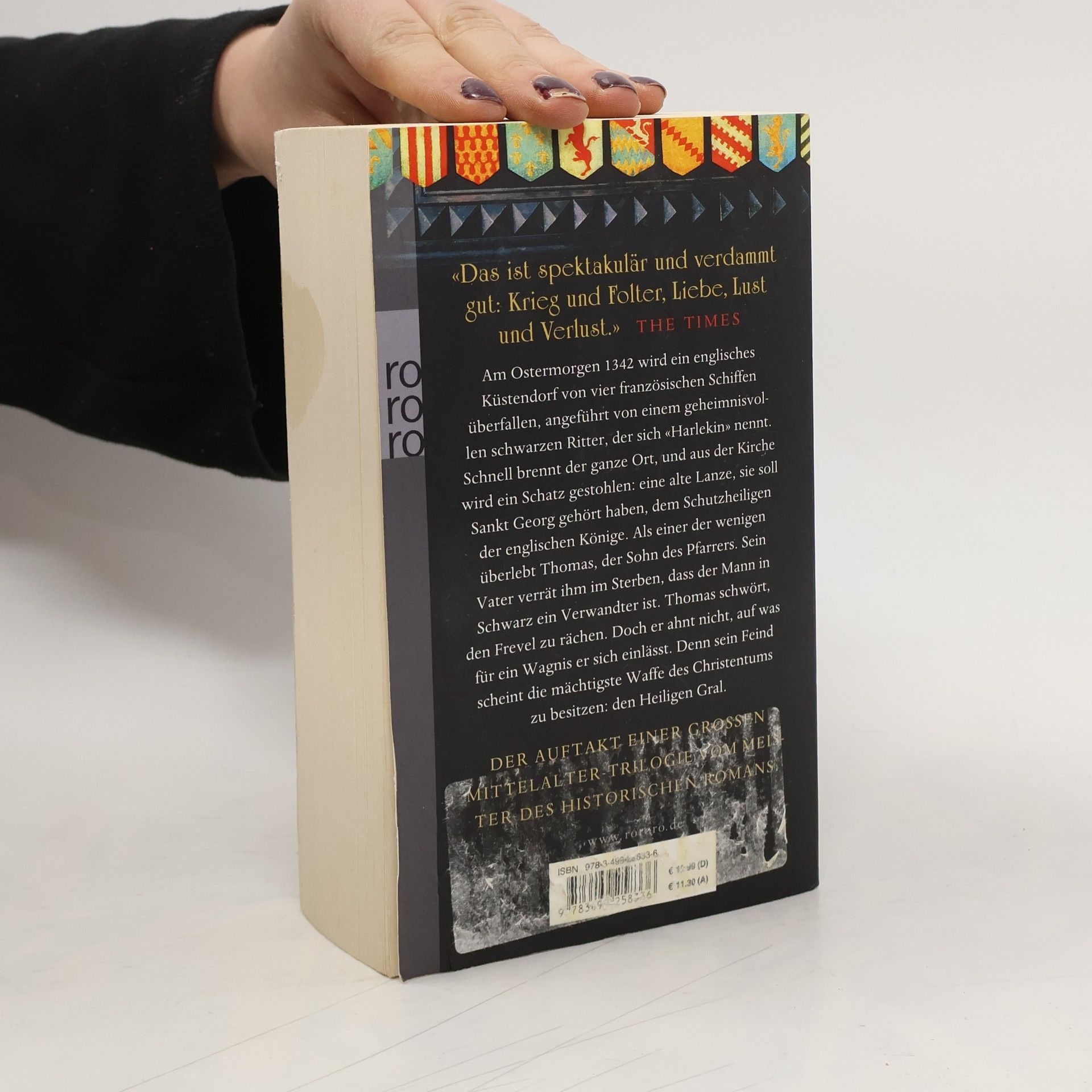 Am Ostermorgen 1342 wird ein englisches Küstendorf von vier französischen Schiffen überfallen, angeführt von einem geheimnisvollen schwarzen Ritter, der sich «Harlekin» nennt. Schnell brennt der ganze Ort, und aus der Kirche wird ein Schatz gestohlen: eine alte Lanze, sie soll Sankt Georg gehört haben, dem Schutzheiligen der englischen Könige. Als einer der wenigen überlebt Thomas, der Sohn des Pfarrers. Sein Vater verrät ihm im Sterben, dass der Mann in Schwarz ein Verwandter ist. Thomas schwört, den Frevel zu rächen. Doch er ahnt nicht, auf was für ein Wagnis er sich einlässt. Denn sein Feind scheint die mächtigste Waffe des Christentums zu besitzen: den Heiligen Gral. DER AUFTAKT EINER GROSSEN MITTELALTER-TRILOGIE VOM MEISTER DES HISTORISCHEN ROMANS Die Bücher vom Heiligen Gral, Band 1