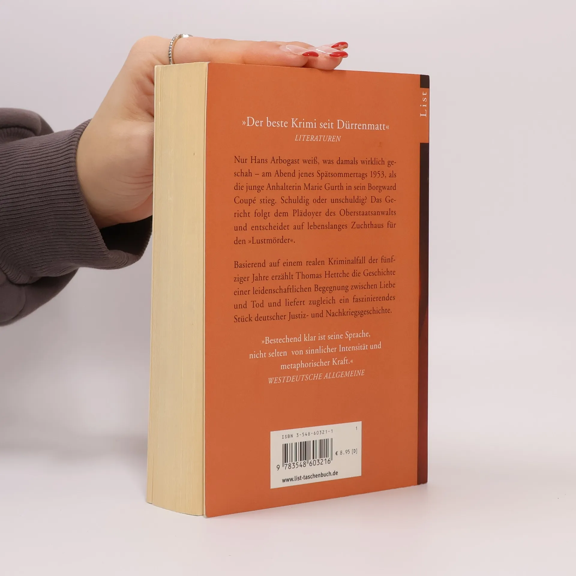 Nur Hans Arbogast weiß, was damals wirklich geschah am Abend jenes Spätsommertages, als die junge Anhalterin Marie Gurth in seinen Borgward Coupé stieg. Schuldig oder unschuldig? Freispruch oder lebenslanges Zuchthaus für den »Lustmörder«? Thomas Hettche beschreibt ein Stück deutscher Nachkriegsgeschichte.