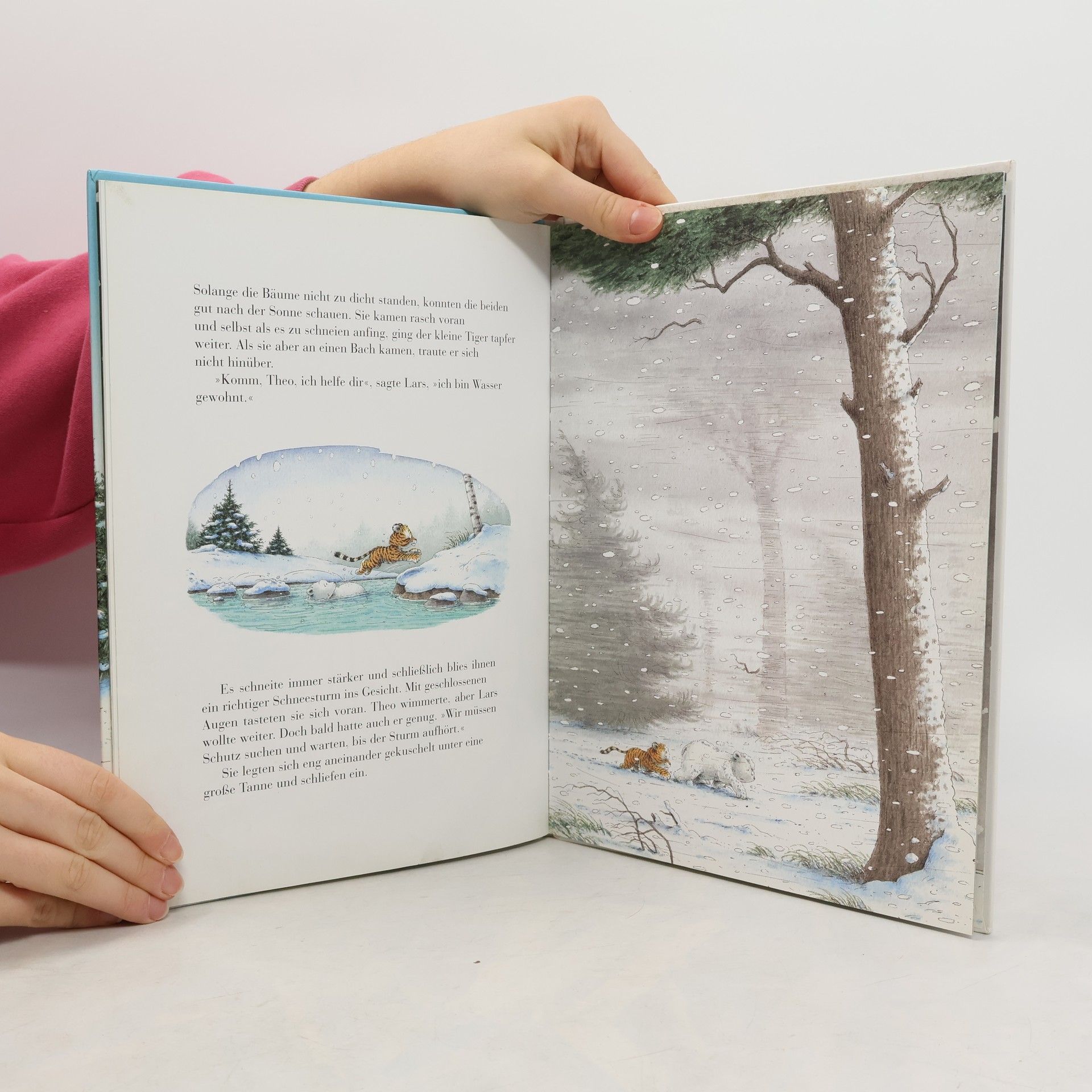 Lars, der kleine Eisbär, trifft unerwartet auf Theo, den kleinen Sibirischen Tiger. Der ist – weit weg von seinen Eltern – völlig verzweifelt. Lars tröstet ihn und hilft ihm den Heimweg zu finden, denn Lars weiß, wie das geht: Er hat sich ja selbst schon oft verlaufen und immer wieder nach Hause gefunden. Zuerst reisen sie versteckt in einem Güterwagen, später irren sie zu Fuß in einem Schneesturm durch große Wälder. Sie überqueren Flüsse und Schluchten, sind froh, dass ihnen eine Schnee-Eule weiterhilft, und reiten gerne auch ein Stück Weg mit Kasim, dem Kamel. Und auf einmal, als Theo die Nase in den Wind hält und schnuppert, riecht es ganz gewaltig nach Zuhause. Theos Eltern sind sehr glücklich, Theo und seinen weißen Bärenfreund zu sehen, und als der Tigervater Lars dann wieder nach Hause bringt, freut sich auch der kleine Eisbär sehr auf das heimatliche Meer.