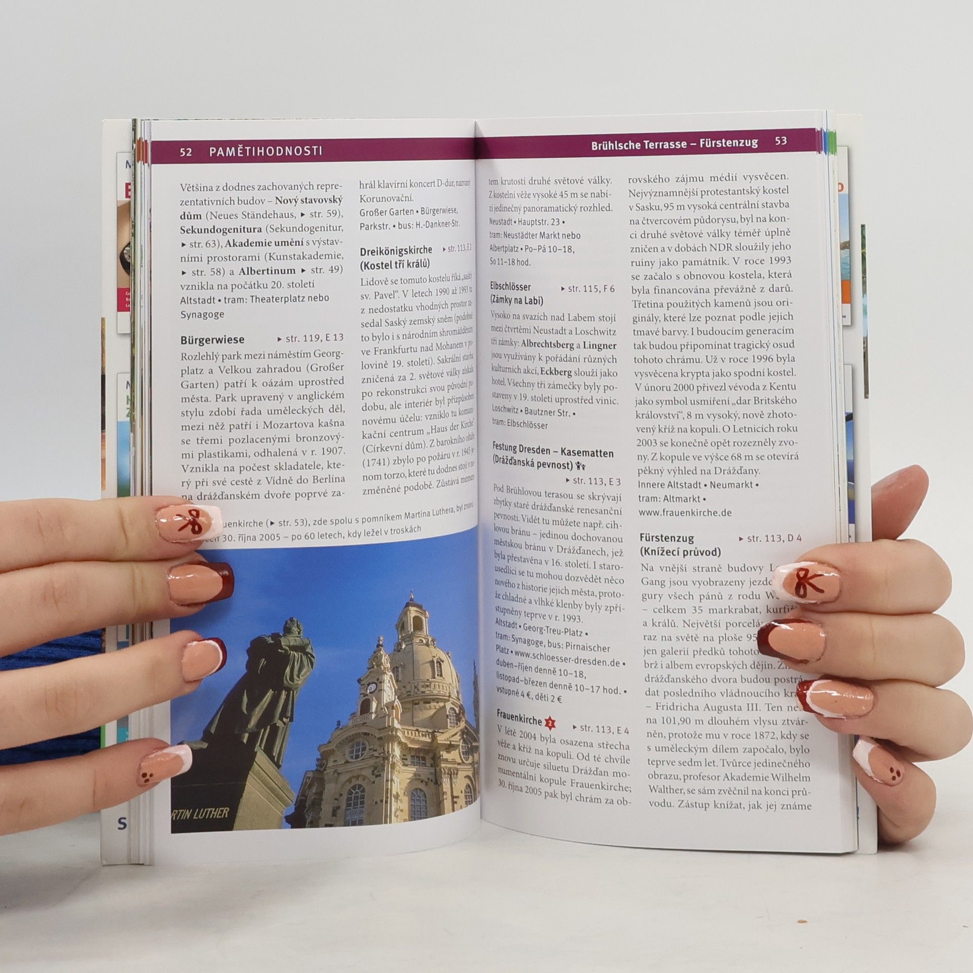 Drážďany, kdysi jedno z nejkrásnějších měst Evropy, mají opět co nabídnout. Davy návštěvníků lačnících po vzdělání proudí do uměleckých muzeí a na břehu Labe obdivují jedinečnou siluetu města, která je téměř stejná jako před 200 lety, kdy ji ztvárnil malíř Canaletto. Divadla uvádějí inscenace, jež bývají příslibem uměleckého zážitku. Mnozí přijíždějí do města na Labi, aby tu strávili třeba jen večer v divadle či na koncertě a pak zavítali do elegantní restaurace na sklenku míšeňského vína. Drážďany objevili už i milovníci nočního života, protože v ulici Weiße Gasse ve staré části města a v nové části ve čtvrti Neustadt vznikly zajímavé kavárny, restaurace a hospůdky. U stolků či u baru najdete sedět pospolu studenty, “domácí” i cizince. Stručný přehledný průvodce po Drážďanech z řady Merian.