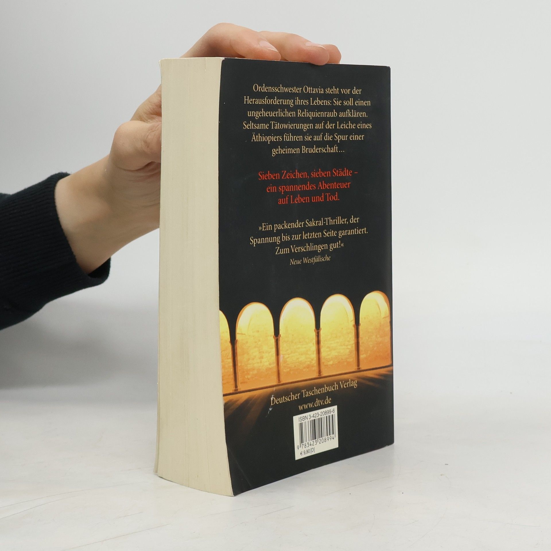 Sieben Zeichen, sieben Städte und eine mysteriöse Bruderschaft: ein spannungsgeladener Abenteuerroman. Der Bestseller aus Spanien! Seltsame Tätowierungen zieren die Leiche eines Äthiopiers. Als Ottavia Salina völlig überraschend zum mächtigsten Mann des Kirchenstaats, Kardinal Sodano, gerufen wird, ahnt sie nicht, was sie erwartet: Die renommierte Paläographin des Vatikanischen Geheimarchivs wird beauftragt, die geheimnisvollen Kreuze und Buchstaben auf dem Toten zu entschlüsseln. Gemeinsam mit dem undurchschaubaren Hauptmann Glauser-Röist von der Schweizergarde und Farag Boswell, einem koptischen Archäologen aus Alexandria, macht sich Ottavia Salina auf die Suche nach den Reliquienräubern. Sieben Prüfungen auf Leben und Tod hat das kuriose Detektivtrio zu bestehen, die um Dantes ›Göttliche Komödie‹ und die sieben Todsünden kreisen. Diese sieben Prüfungen führen sie auch in die sieben historischen Hauptstädte des Christentums: nach Rom, Ravenna, Athen, Jerusalem, Konstantinopel, Alexandria und Antiochia. Ein fesselnder Abenteuerroman um die bestgehüteten Geheimnisse des Christentums.