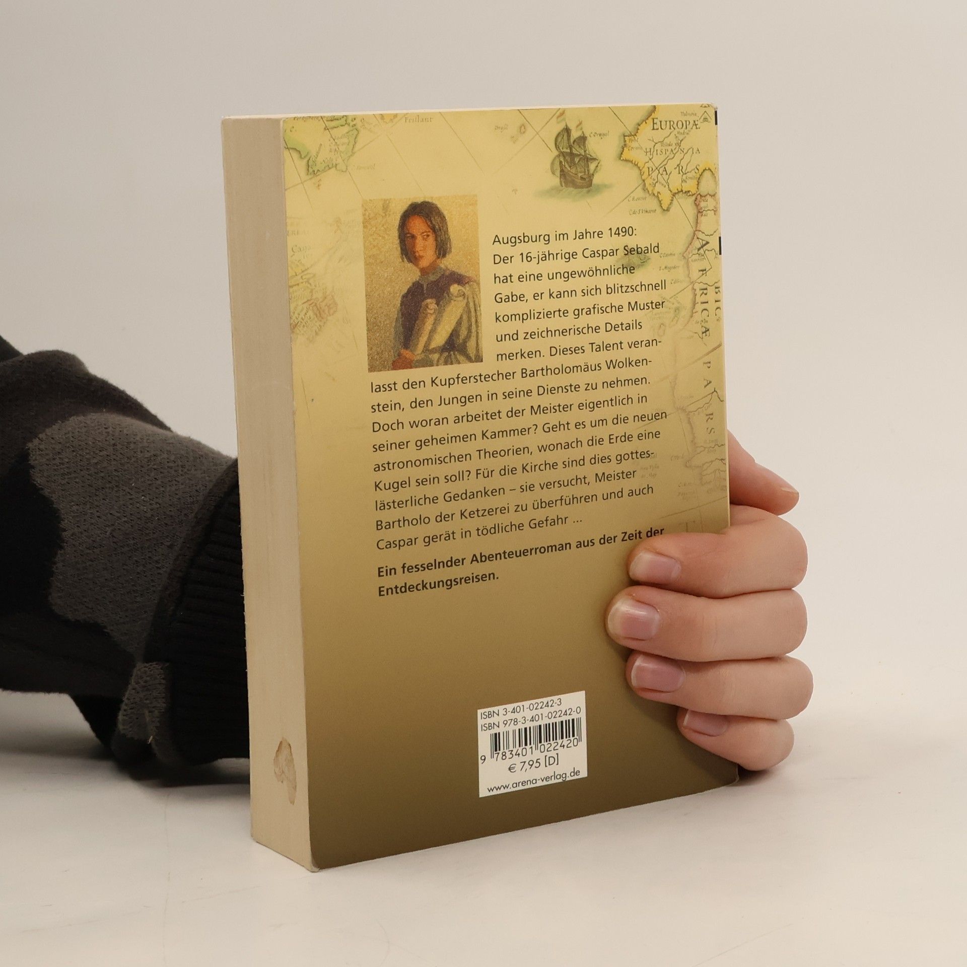 Augsburg im Jahre 1490: Der 16-jährige Caspar Sebald hat eine ungewöhnliche Gabe, er kann sich blitzschnell komplizierte grafische Muster und zeichnerische Details merken. Dieses Talent veranlasst den Kupferstecher Bartholomäus Wolkenstein, den Jungen in seine Dienste zu nehmen. Doch woran arbeitet der Meister eigentlich in seiner geheimen Kammer und was enthalten die Briefe und Päckchen, die er von Boten aus allen Teilen Europas empfängt? Geht es dabei um die neuen astronomischen Theorien, wonach die Erde eine Kugel sei? Für die Kirche sind dies gotteslästerliche Gedanken - und tatsächlich setzen der Augsburger Domherr und der berüchtigte Inquisitor Heinrich Institoris alles daran, Meister Bartholo der Ketzerei zu überführen. Als wäre das alles nicht schlimm genug, soll Caspar ihnen auch noch dabei helfen - oder ihm droht der Scheiterhaufen! Und würde er einfach fliehen, dann würde er des Meisters schöne und rätselhafte Magd Klara nie wiedersehen.