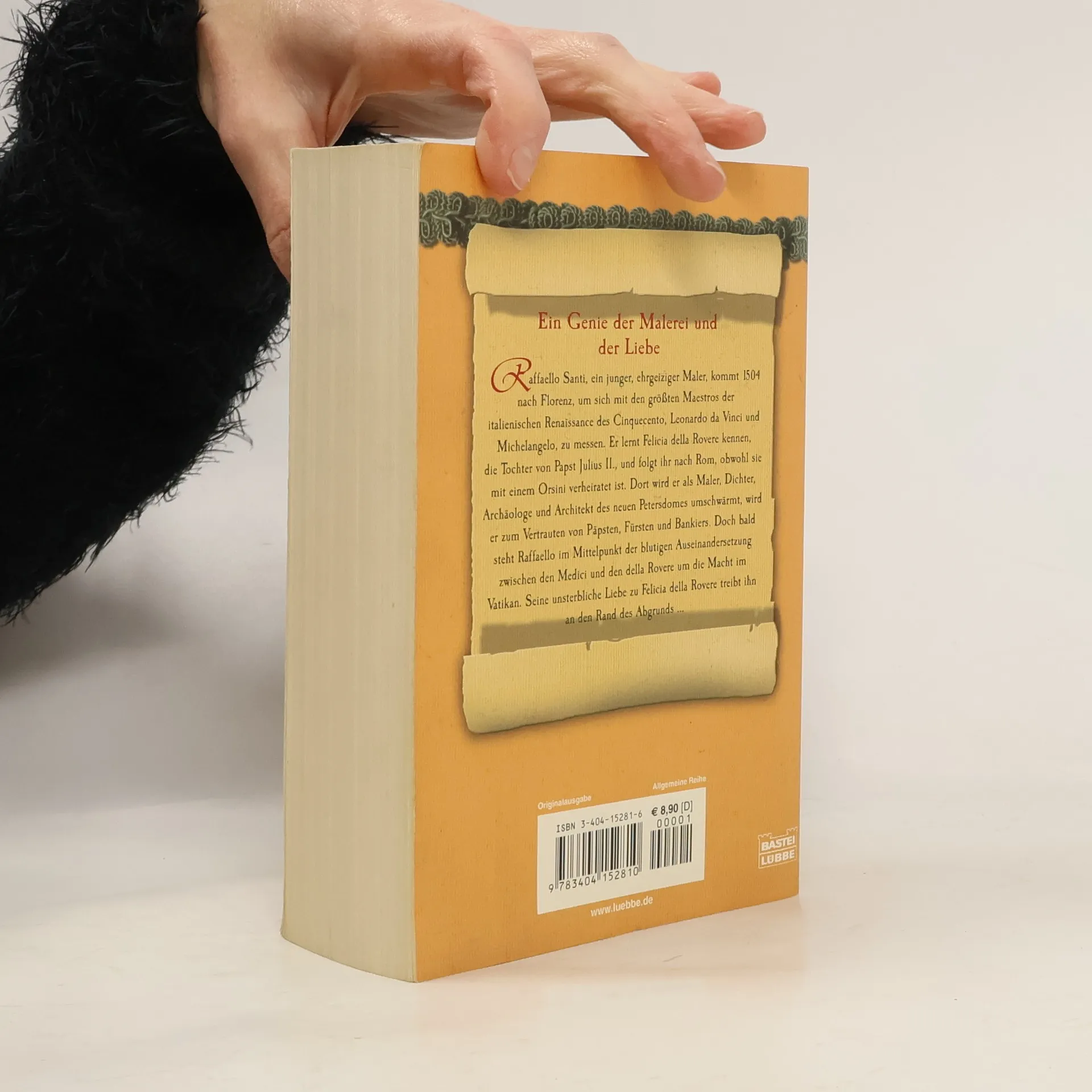 Ein Genie der Malerei und der Liebe. Raffaello Santi, ein junger, ehrgeiziger Maler, kommt 1504 nach Florenz, um sich mit den größten Maestros der italienischen Renaissance des Cinquecento, Leonardo da Vinci und Michelangelo, zu messen. Er lernt Felicia della Rovere kennen, die Tochter von Papst Julius II., und folgt ihr nach Rom, obwohl sie mit einem Orsini verheiratet ist. Dort wird er als Maler, Dichter, Archäologe und Architekt des neuen Petersdomes umschwärmt, wird er zum Vertrauten von Päpsten, Fürsten und Bankiers. Doch bald steht Raffaello im Mittelpunkt der blutigen Auseinandersetzung zwischen den Medici und den della Rovere um die Macht im Vatikan. Seine unsterbliche Liebe zu Felicia della Rovere treibt ihn an den Rand des Abgrunds ...