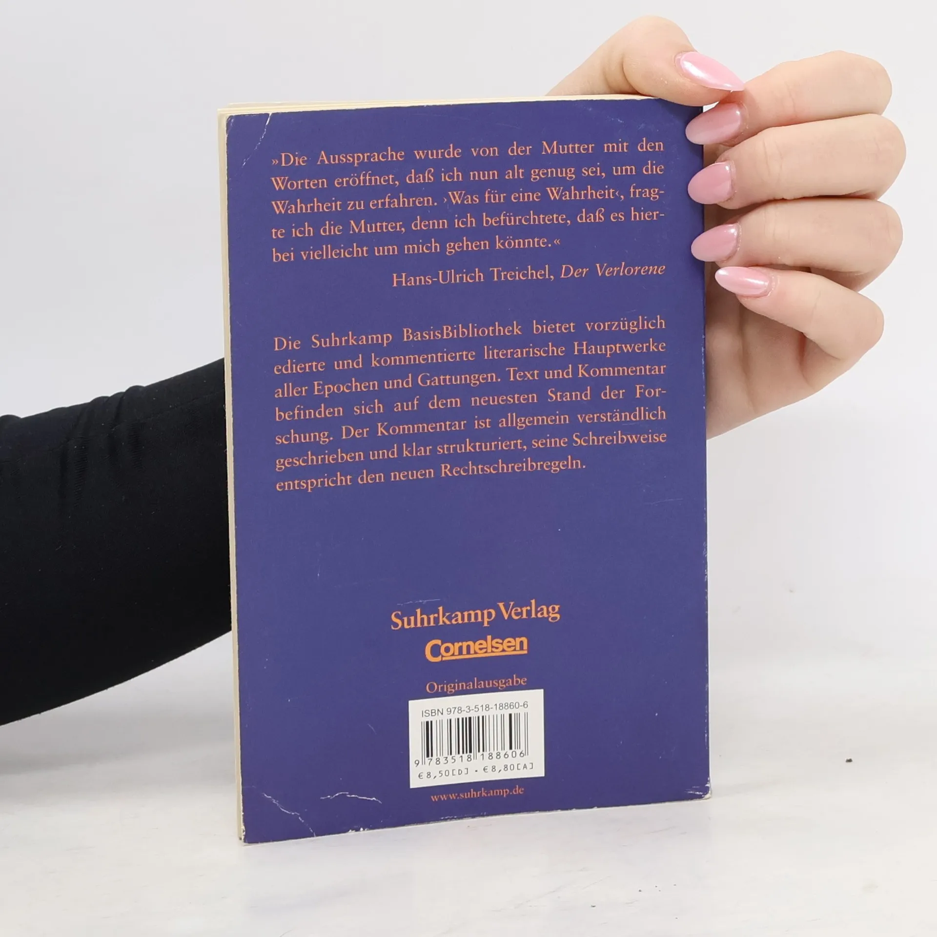 Diese Ausgabe der »Suhrkamp BasisBibliothek - Arbeitstexte für Schule und Studium« bietet Hans-Ulrich Treichels erfolgreiche, in über zwanzig Sprachen übersetzte Novelle Der Verlorene , ergänzt um einen Kommentar, der alle für das Verstöndnis des Textes erforderlichen Informationen enthält, sowie einen Anhang mit Treichels erster Frankfurter Poetikvorlesung und einigen Gedichten.