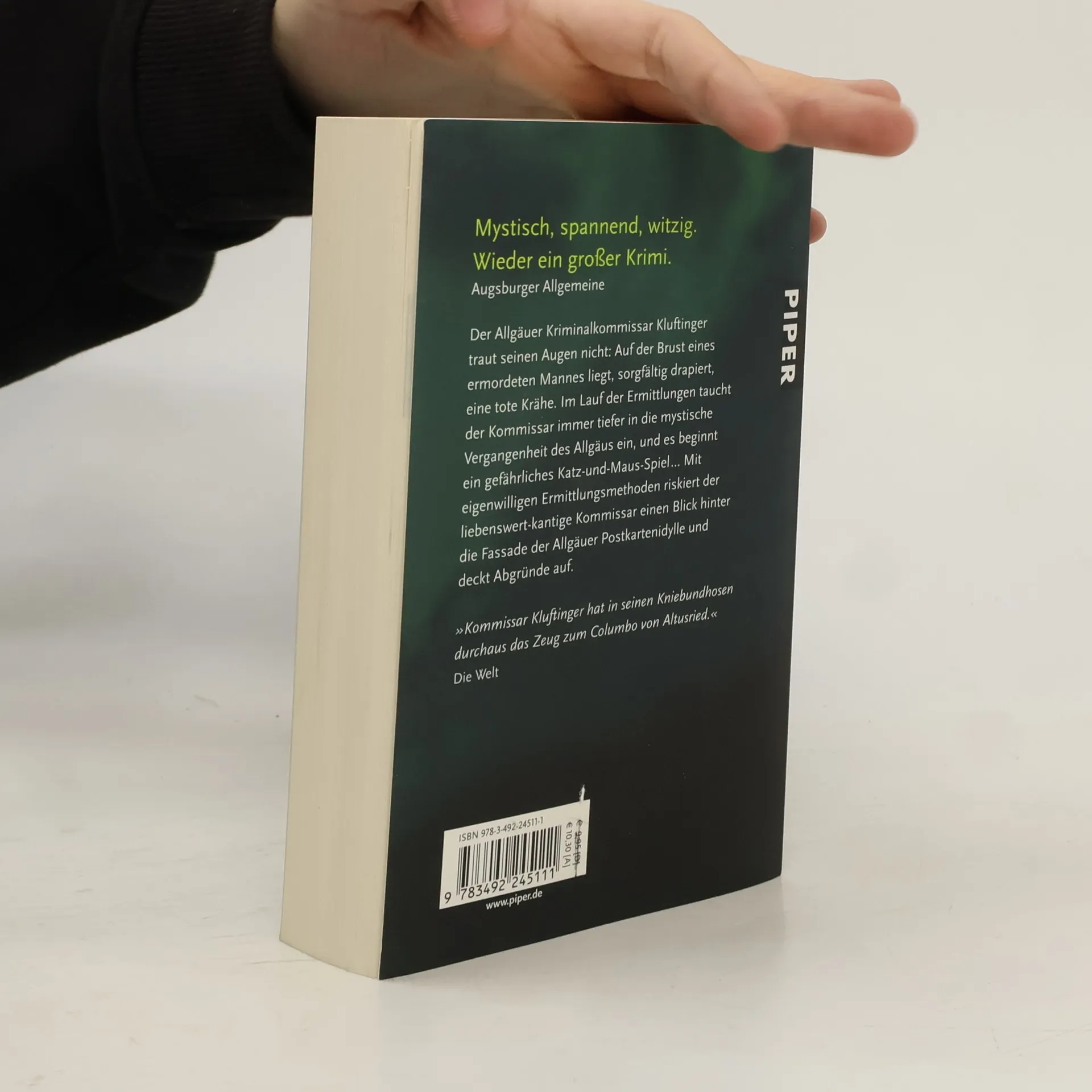 Der Allgäuer Kriminalkommissar Kluftinger traut seinen Augen nicht: Auf der Brust eines toten Mannes in einem Wald bei Kempten liegt, sorgfältig drapiert, eine tote Krähe. Im Lauf der Ermittlungen taucht der Kommissar immer tiefer in die mystische Vergangenheit des Allgäus ein, und es beginnt ein Katz-und-Maus-Spiel mit dem Mörder, bei dem die Zeit gegen ihn arbeitet. Denn alle Zeichen sprechen dafür, dass das Morden weitergeht … Mit eigenwilligen Ermittlungsmethoden riskiert der liebenswert-kantige Kommissar einen Blick hinter die Fassade der Allgäuer Postkartenidylle und deckt Abgründe auf.