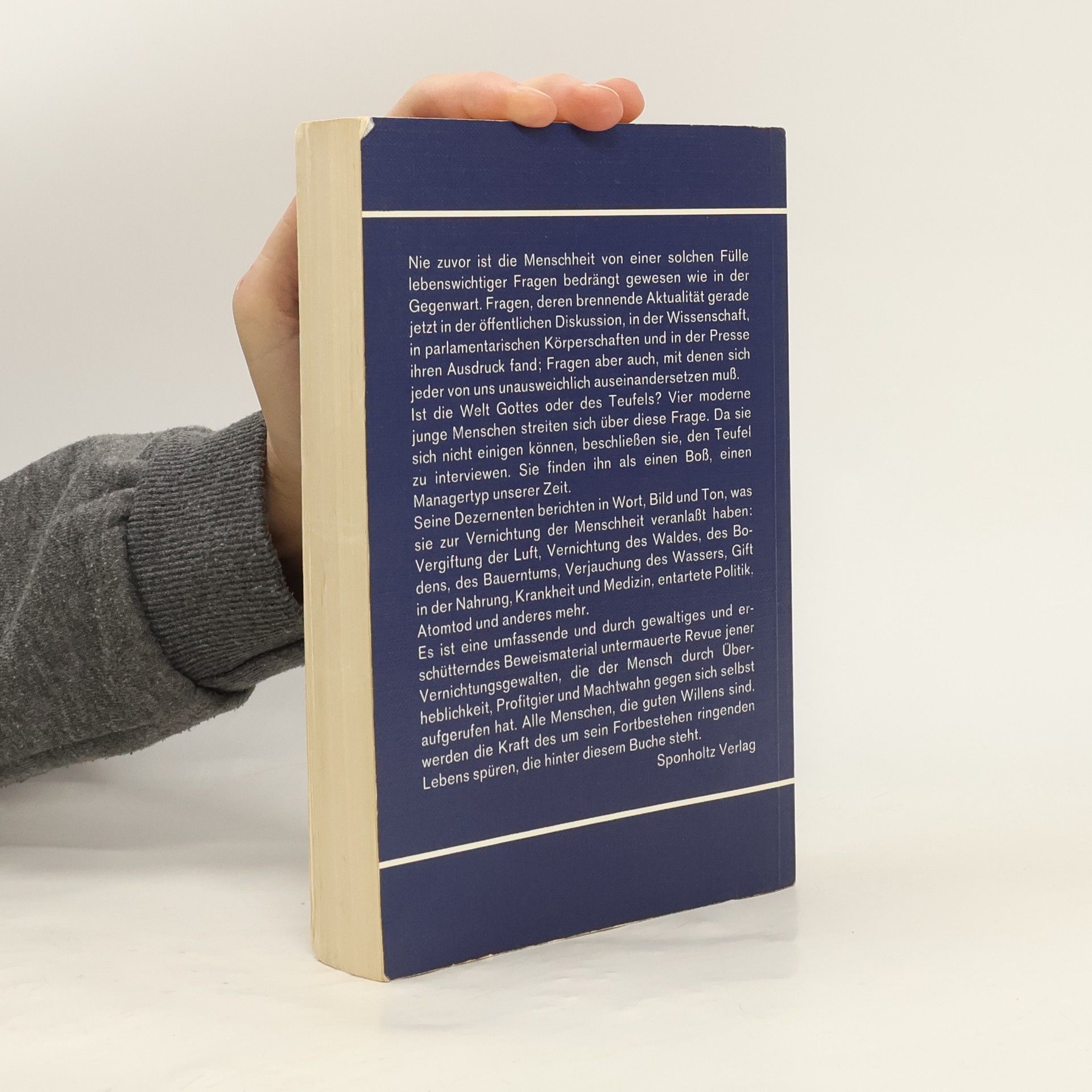 In Form eines fiktiven Interviews mit dem Teufel zeigt der Autor die Gefahren auf, die der Mensch im Laufe der Entwicklung gegen sich selbst heraufbeschworen hat. Das Buch hat seit seinem ersten Erscheinen zahlreiche Neuauflagen erlebt und ist zu einem Klassiker der Umweltschutzliteratur geworden.