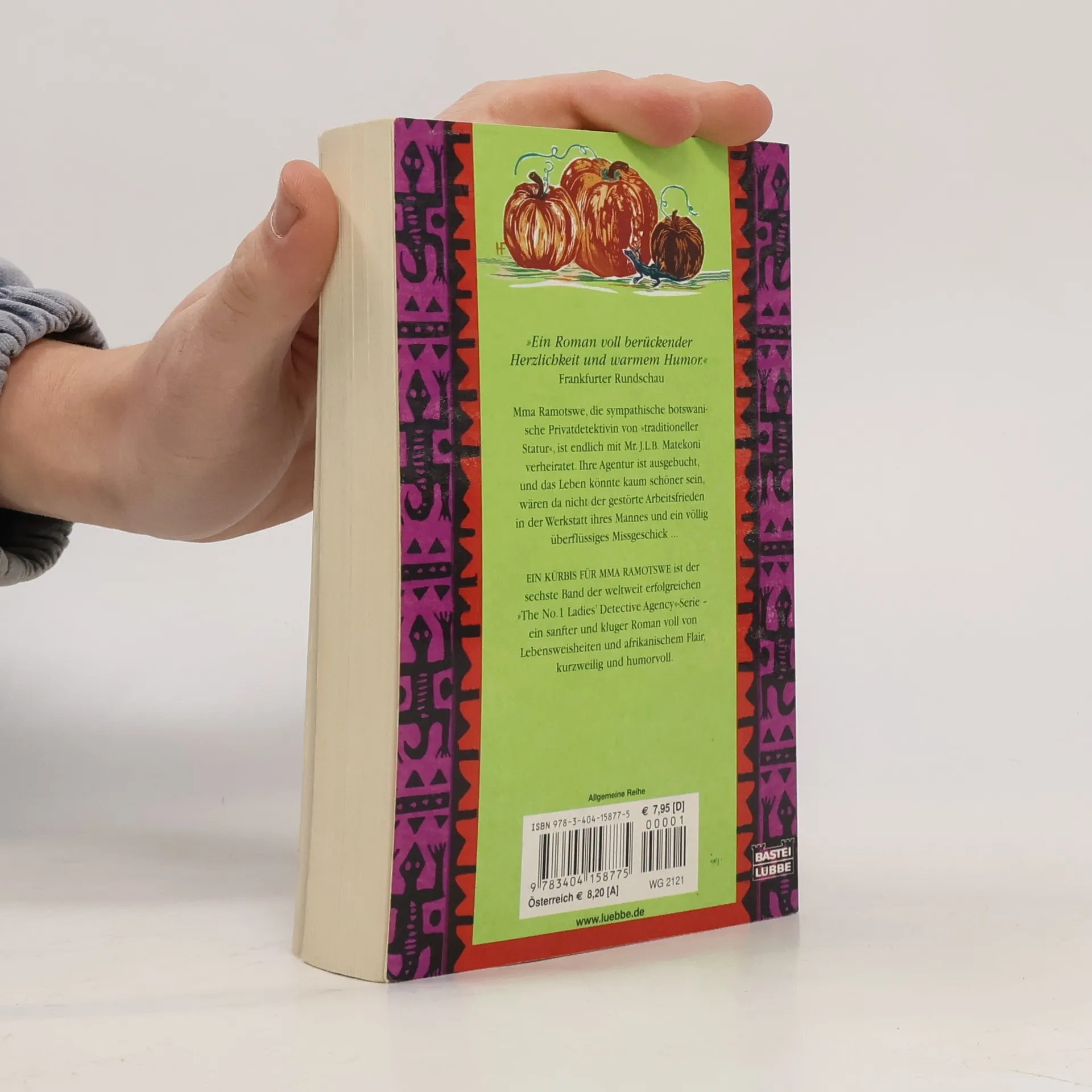 Mma Ramotswe, die sympathische botswanische Privatdetektivin von „traditioneller Statur“, ist endlich mit Mr. J. L. B. Matekoni verheiratet. Ihre Agentur ist ausgebucht, und das Leben könnte kaum schöner sein, wären da nicht der gestörte Arbeitsfrieden in der Werkstatt ihres Mannes und ein völlig überflüssiges Missgeschick ... Ein Kürbis für Mma Ramotswe ist der sechste Band der weltweit erfolgreichen "The No.1 Ladies' Detective Agency"-Serie - ein sanfter und kluger Roman voll von Lebensweisheiten und afrikanischem Flair, kurzweilig und humorvoll.