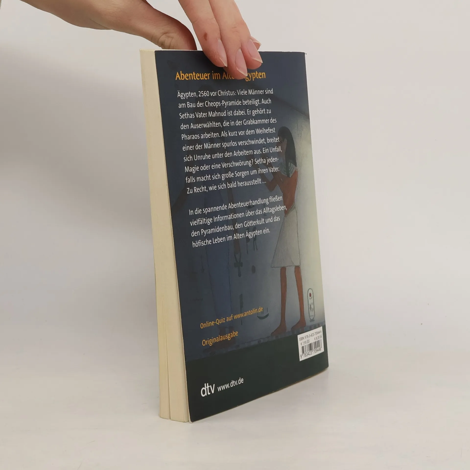 »Wir müssen versuchen die Grabwächter zu bestechen, um in die Pyramide zu gelangen.« Ägypten, 2560 vor Christus: Viele Männer sind am Bau der Cheops-Pyramide beteiligt. Auch Sethas Vater Mahnud ist dabei. Er gehört zu den Auserwählten, die in der Grabkammer des Pharaos arbeiten. Als kurz vor dem Weihefest einer der Männer spurlos verschwindet, breitet sich Unruhe unter den Arbeitern aus. Ein Unfall, Magie oder eine Verschwörung? Setha jedenfalls macht sich große Sorgen um ihren Vater. Zu Recht, wie sich bald herausstellt … In die spannende Abenteuerhandlung fließen vielfältige Informationen über das Alltagsleben, den Pyramidenbau, den Götterkult und das höfische Leben im alten Ägypten ein.