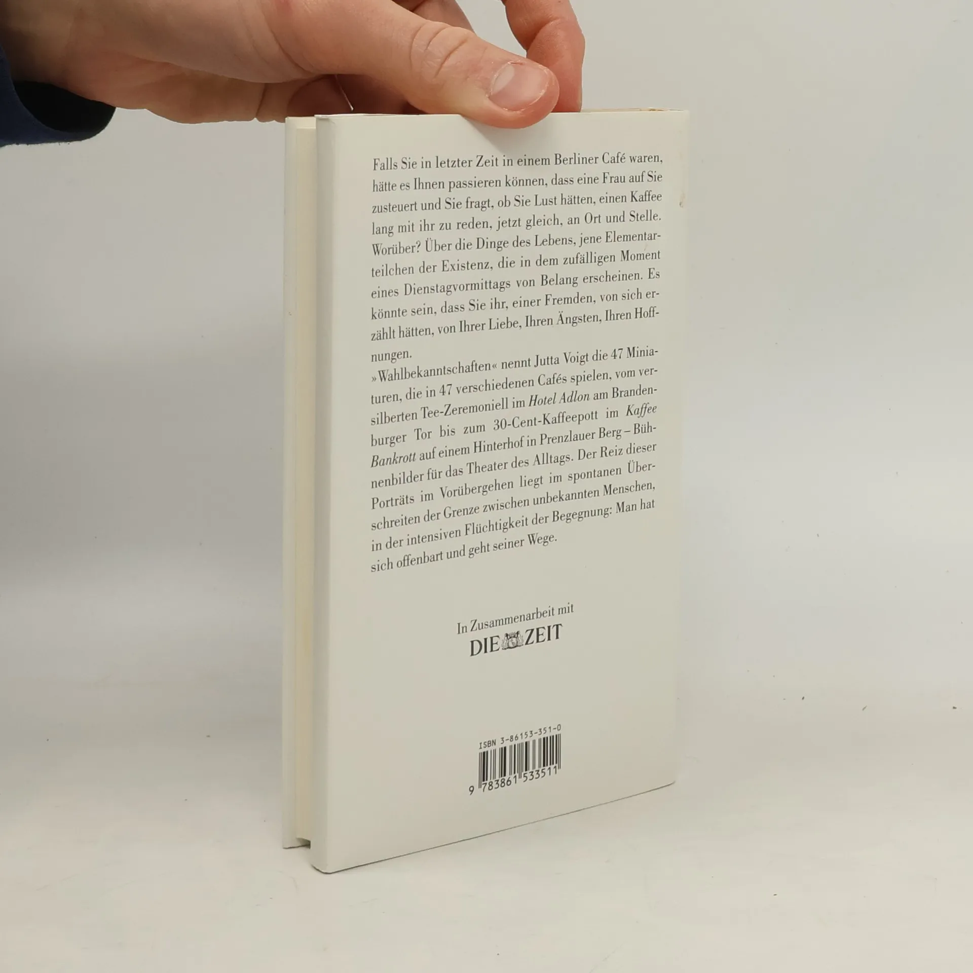 Falls Sie in letzter Zeit in einem Berliner Café waren, hätte es Ihnen passieren können, dass eine Frau auf Sie zukommt und Sie fragt, ob Sie Lust hätten, einen Kaffee lang mit ihr zu reden, jetzt gleich, an Ort und Stelle. Worüber? Über die Dinge des Lebens, jene Elementarteilchen der Existenz, die in dem zufälligen Moment eines Vormittags von Belang erscheinen. Es könnte sein, dass Sie ihr, einer Fremden, von sich erzählt hätten, von Ihrer Liebe, Ihren Ängsten, Ihren Hoffnungen. „Wahlbekanntschaften“ nennt Jutta Voigt die 47 Miniaturen, die in 47 verschiedenen Cafés spielen- Bühnenbilder für das Theater des Alltags. Der Reiz dieser Porträts liegt im spontanen Überschreiten der Grenze zwischen unbekannten Menschen, in der intensiven Flüchtigkeit der Begegnung. Zurück bleiben Einblicke in die Vielfalt von Lebensentwürfen, wie sie sonst selten zu bekommen sind. Pressestimme: „Jutta Voigts pointiert formulierte Kolumnen sind eine wunderbare Lektüre; einmal begonnen, möchte man das Bändchen nicht mehr aus der Hand legen. Die Gespräche mit den “Wahlbekanntschaften„ dokumentieren en miniature die Entwicklungen der deutschen Gesellschaft nach 1989, zumal Voigt in vielen Fällen Menschen eine Stimme gibt, die sonst keine Gelegenheit zur Äußerung haben.“ (Tageblatt, Luxemburg)