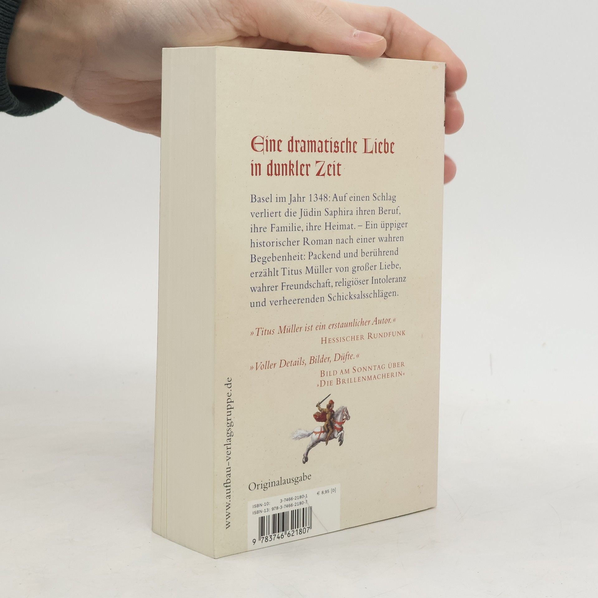 Eine dramatische Liebe in dunkler Zeit Basel im Jahr 1348: Auf einen Schlag verliert die Jüdin Saphira ihren Beruf, ihre Familie, ihre Heimat. „Bringe dieses Kästchen zum König“, flüstert der Vater, bevor er an seinen Wunden stirbt. Doch die junge Frau wird von mächtigen und mitleidslosen Feinden gejagt. Es sind die dunklen Jahre - die Pest wütet in der stolzen Stadt, und deren Bürger richten ihren Zorn gegen die Juden. Was ist das Leben einer Jüdin wert? Eines haben Saphiras Verfolger nicht bedacht: Zwei Männer sind unsterblich in sie verliebt. Ein üppiger historischer Roman nach einer wahren Begebenheit: Packend und berührend erzählt Titus Müller von großer Liebe, wahrer Freundschaft, religiöser Intoleranz und verheerenden Schicksalsschlägen. „Titus Müller ist ein erstaunlicher Autor.“ Hessischer Rundfunk „Voller Details, Bilder, Düfte.“ Bild am Sonntag über „Die Brillenmacherin“